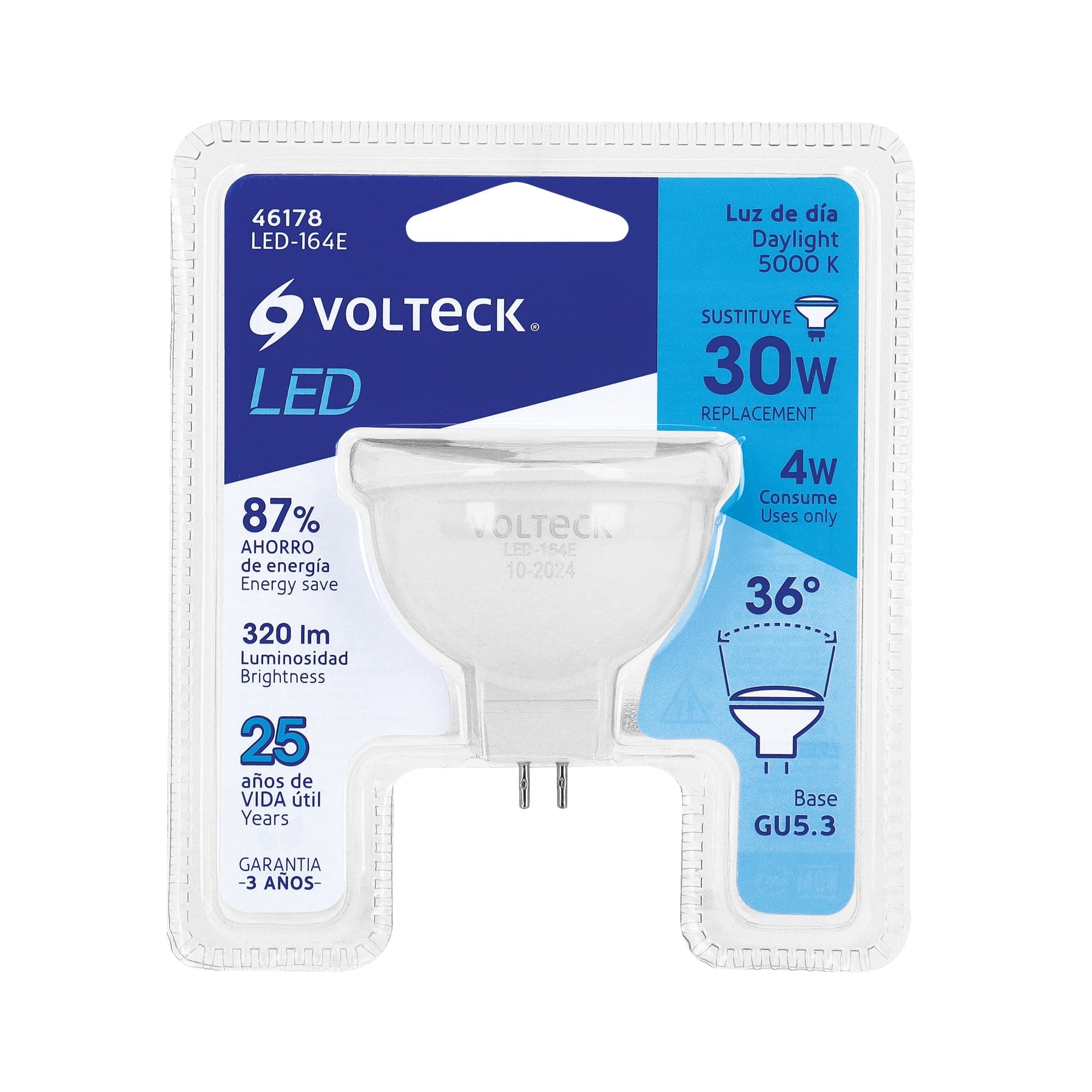 Esta lámpara LED de 4W tipo MR16 ofrece un flujo luminoso de 320 lm con luz de día a 5,000 K, ideal para iluminación decorativa y de acento. Incorpora un cuerpo de PBT con pantalla de policarbonato que garantiza mayor durabilidad y un encendido instantáneo con bajo consumo. Su ángulo de apertura de 36° permite un haz bien definido y eficiente.