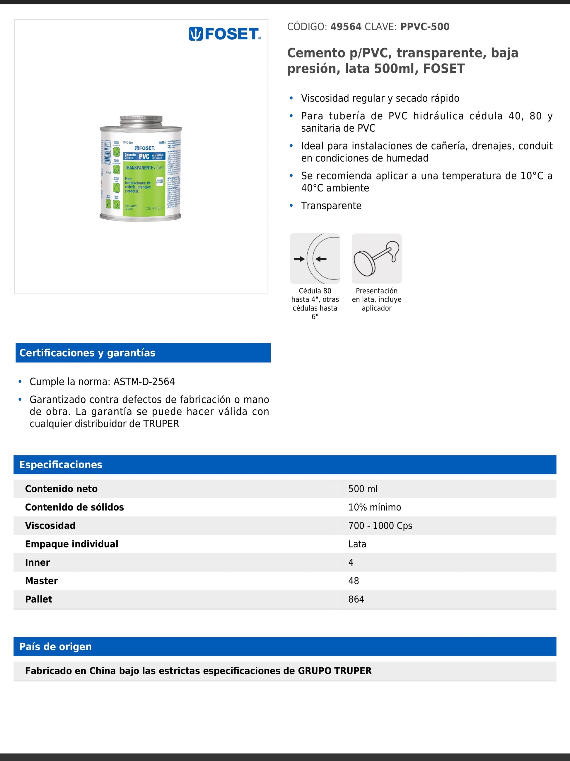 Adhesivo de viscosidad regular y secado rápido, diseñado para unir tubería de PVC hidráulica cédula 40, 80 y sanitaria. Ideal para instalaciones de cañería, drenajes y conduit en condiciones de humedad. Se recomienda aplicar en un rango de temperatura ambiente de 10 °C a 40 °C. Presentación en lata transparente con aplicador incluido.