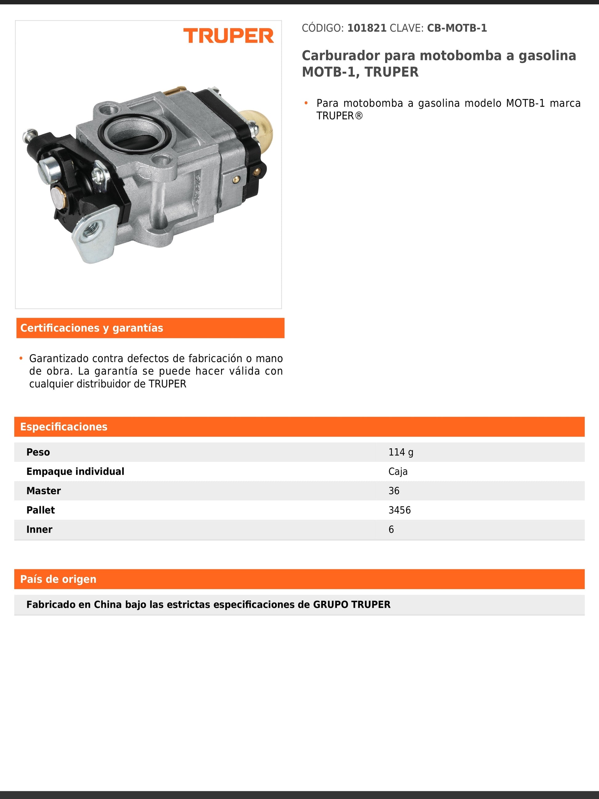 Carburador diseñado para motobomba a gasolina modelo MOTB-1 de la línea Truper. Fabricado bajo estrictos estándares de calidad que aseguran un rendimiento confiable y duradero.