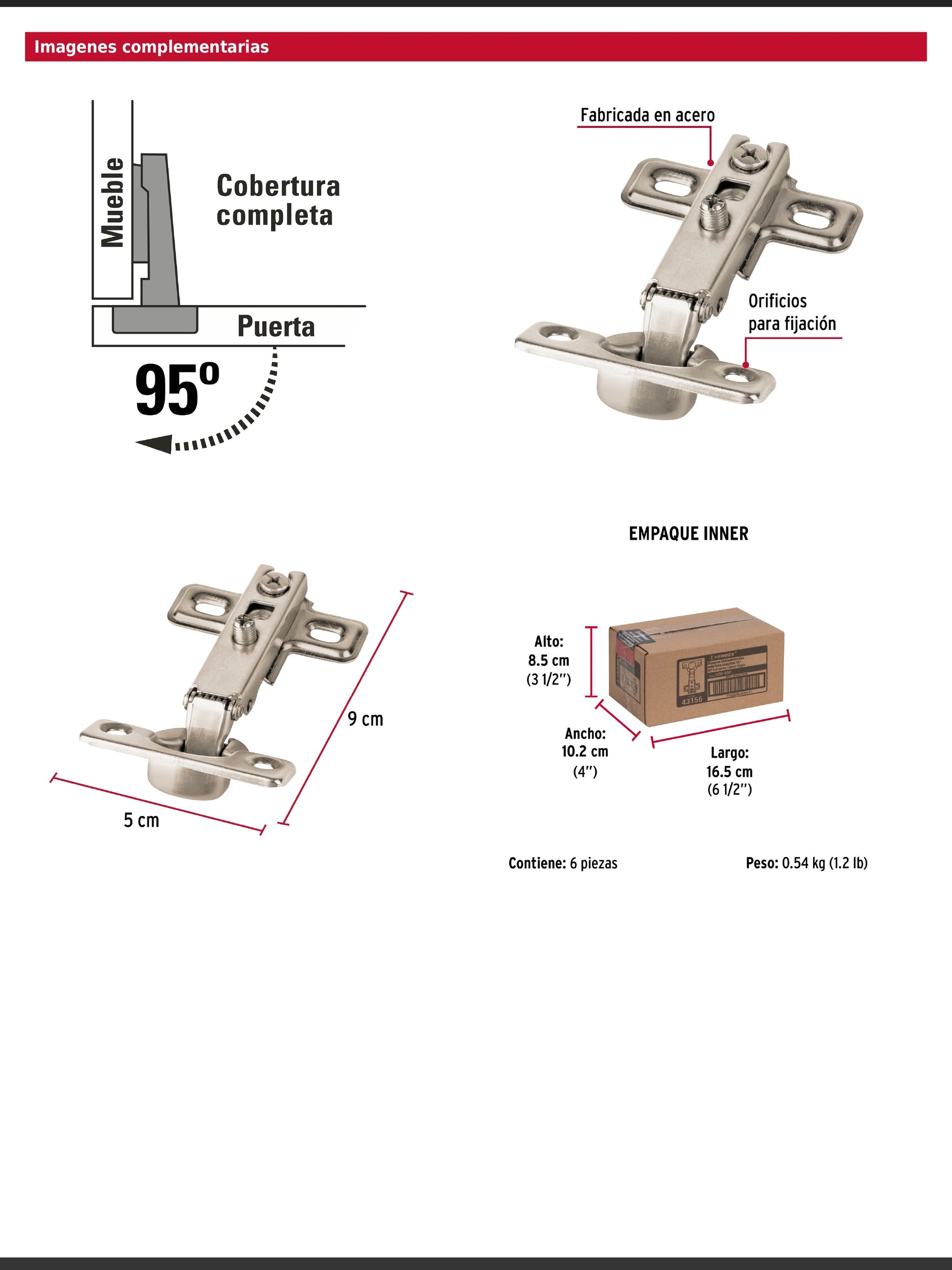 Bisagras fabricadas en acero con acabado niquelado, con cierre suave y diseño de instalación oculta para gabinetes. Son ideales para carpintería y la industria mueblera, e incluyen tornillería para su montaje.