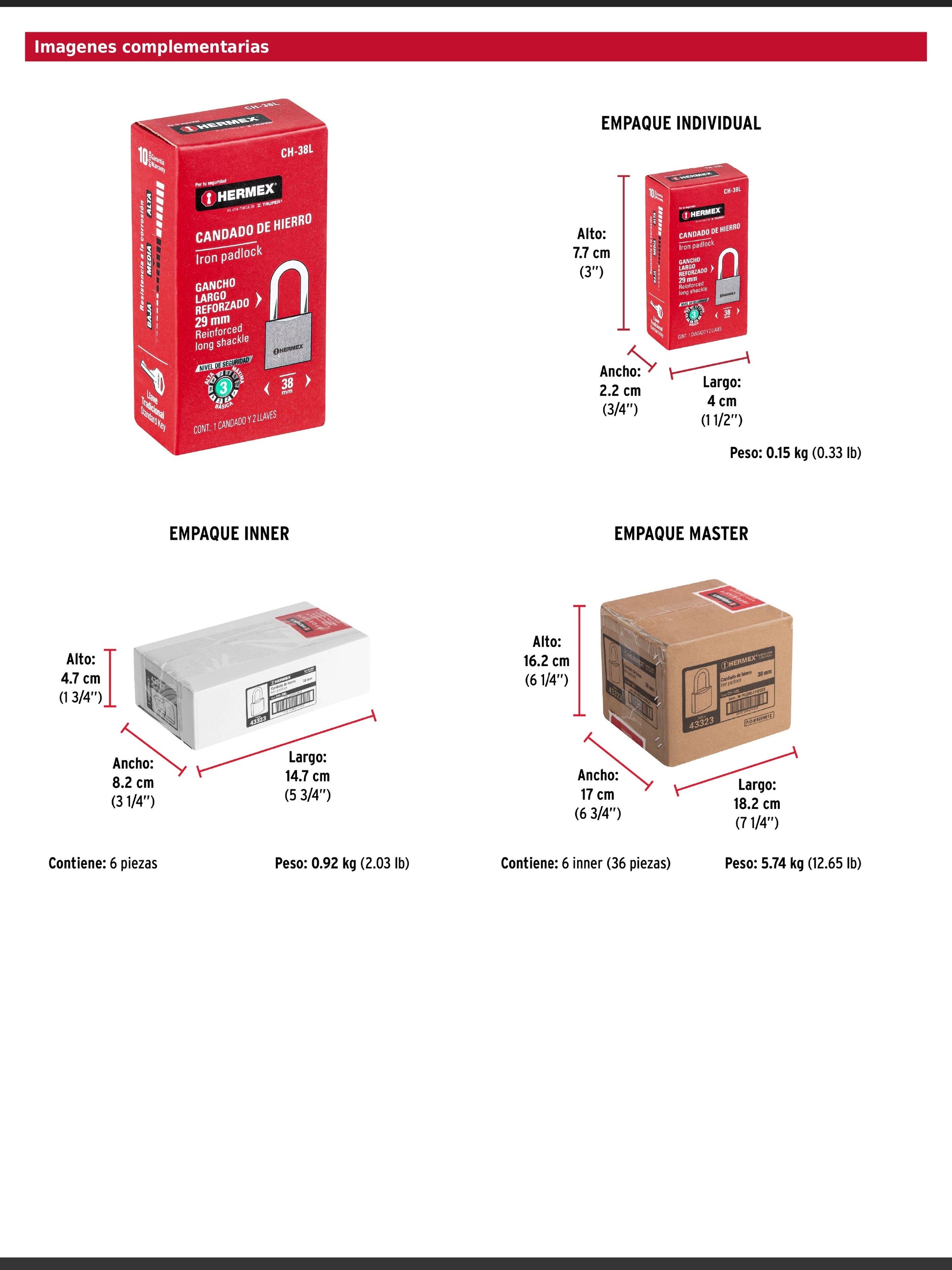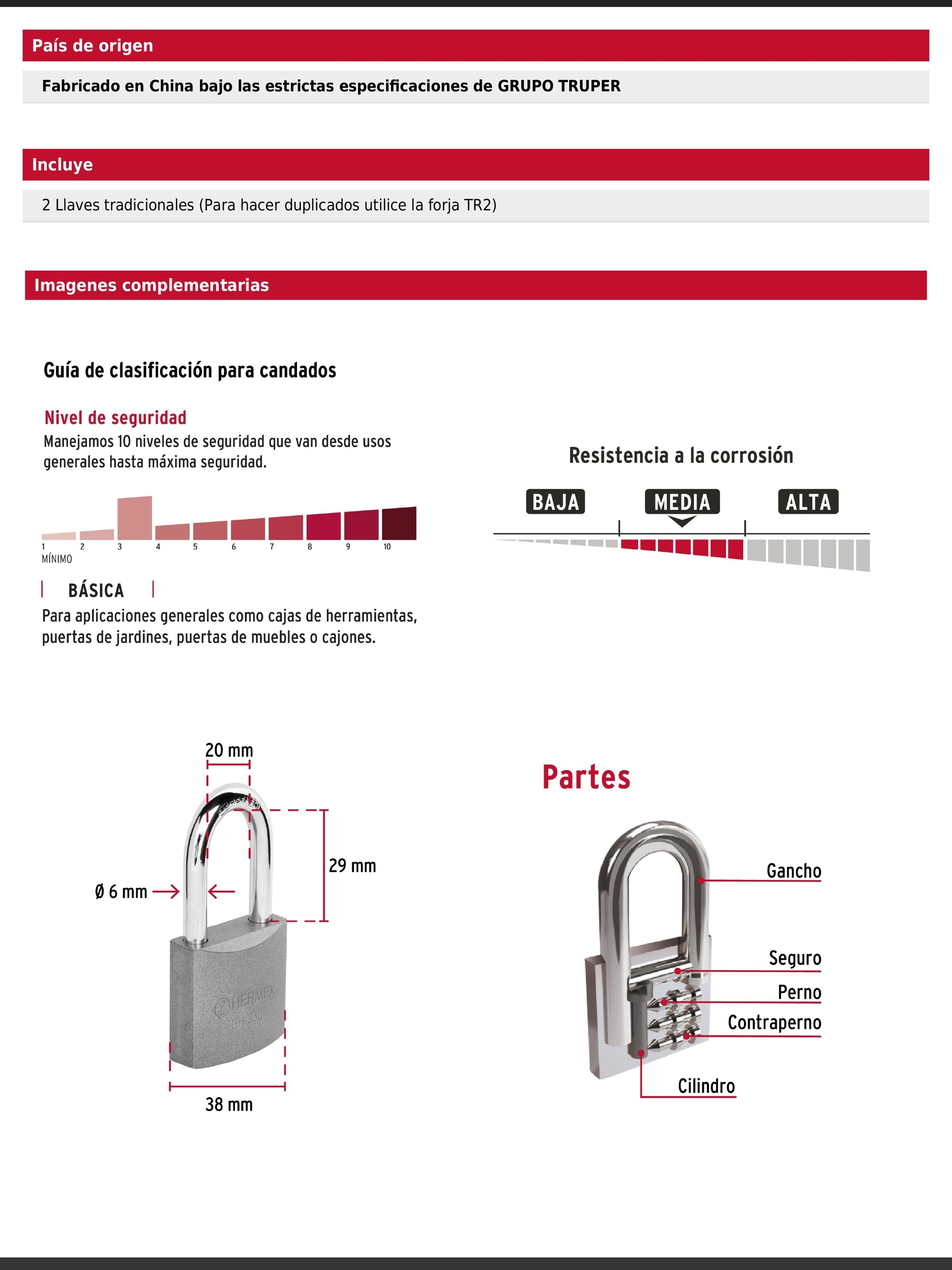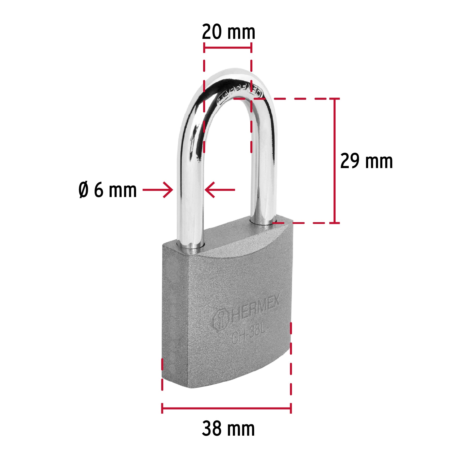 Candado de hierro en una sola pieza con gancho largo de acero cromado reforzado. Incorpora seguro tipo perno estándar y cilindro de latón sólido con 5 pines que ofrecen resistencia a robos. Su mecanismo interno es resistente a la corrosión para mayor durabilidad.