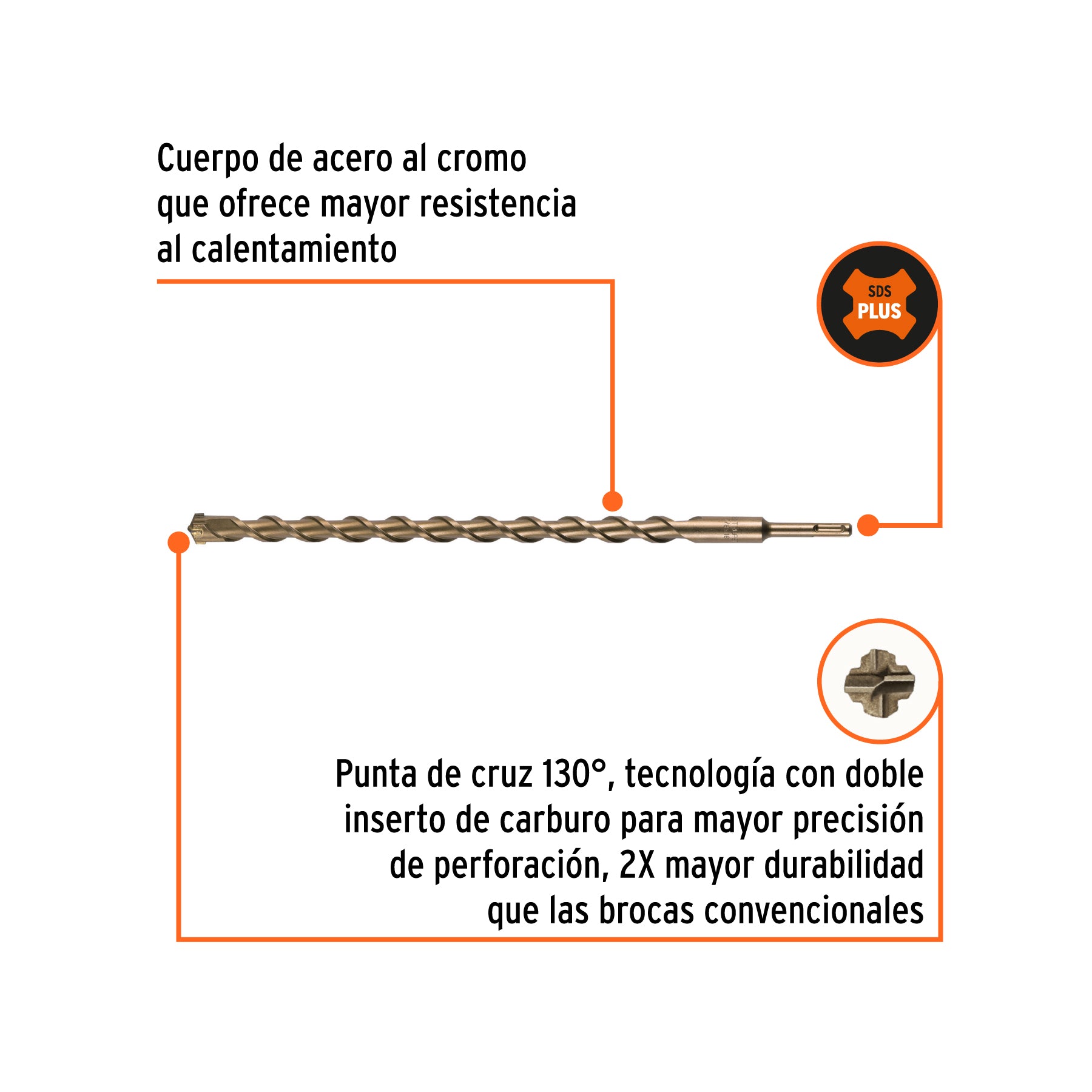 Broca profesional con punta de cruz y doble inserto de carburo, diseñada para brindar máxima precisión y durabilidad 2 veces superior a la de una broca convencional. Su cuerpo de acero al cromo ofrece alta resistencia al calentamiento, mientras que su estructura evita atascos durante la perforación. Compatible con la mayoría de rotomartillos SDS Plus.