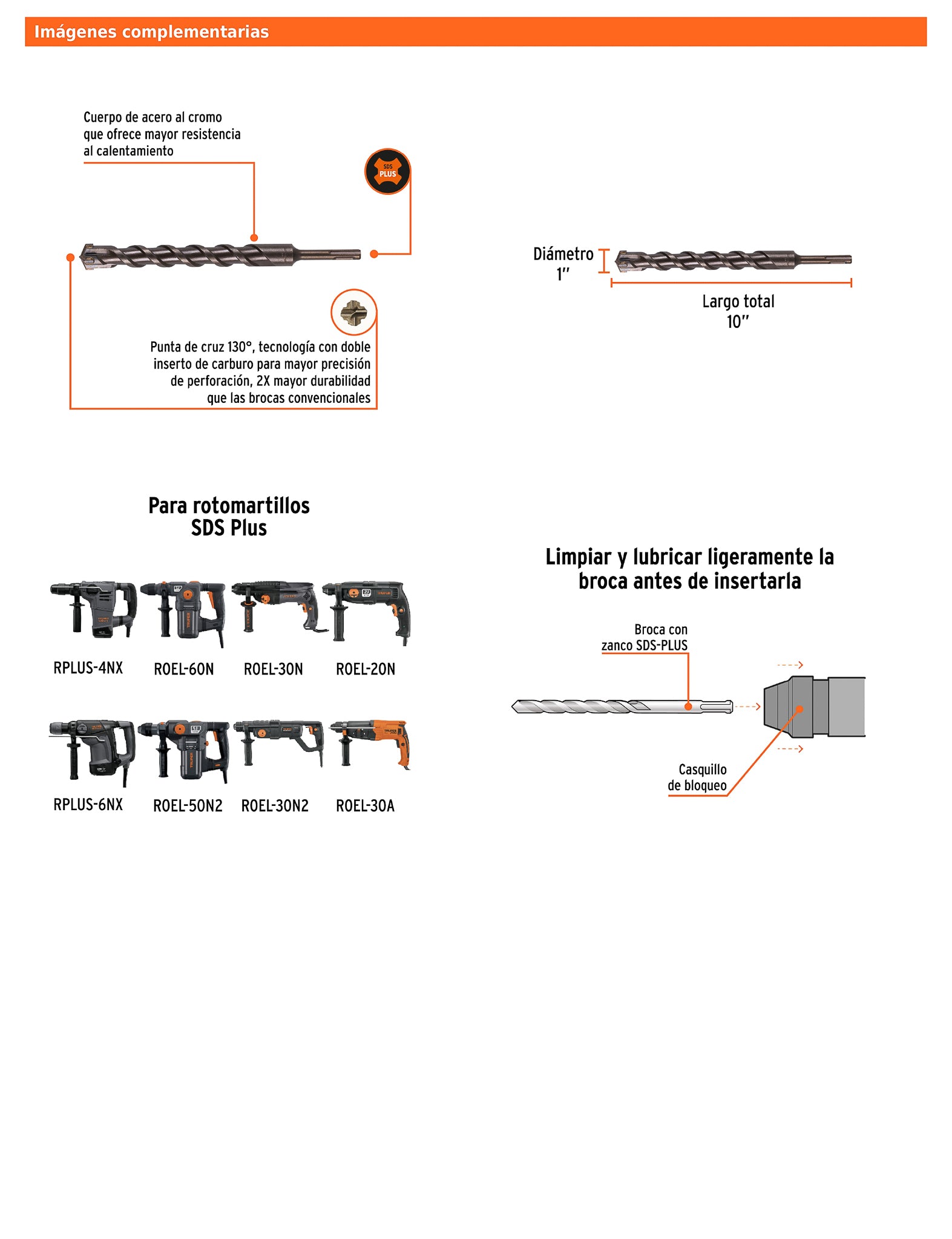 Broca de alto rendimiento con punta de cruz y doble inserto de carburo, diseñada para ofrecer mayor precisión en la perforación y hasta el doble de durabilidad que las brocas convencionales. Su cuerpo de acero al cromo mejora la resistencia al calentamiento y su diseño evita que se atore durante el uso. Compatible con la mayoría de rotomartillos SDS Plus.