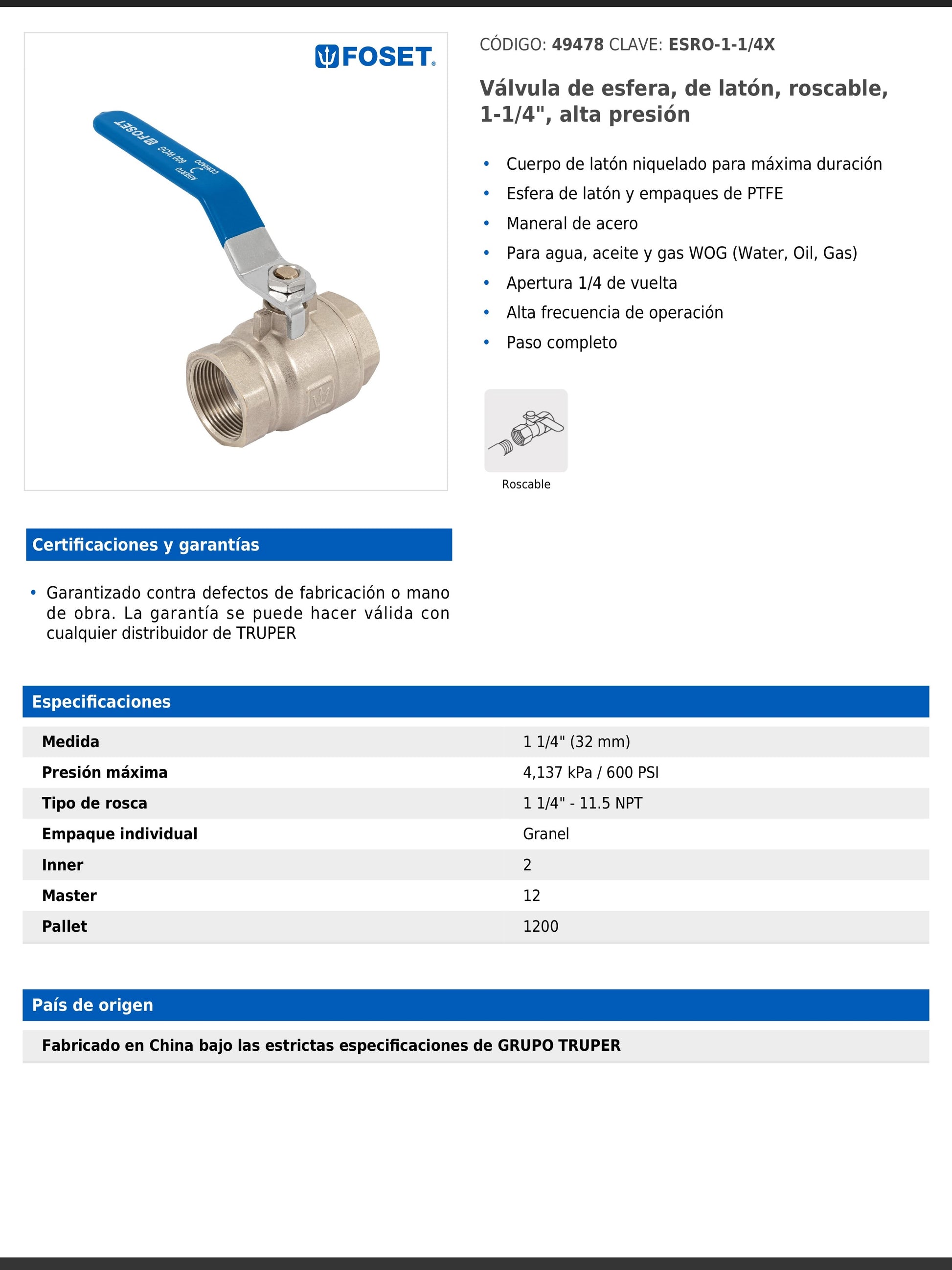 - Tipo de rosca 1 1/4" - 11.5 NPT.
