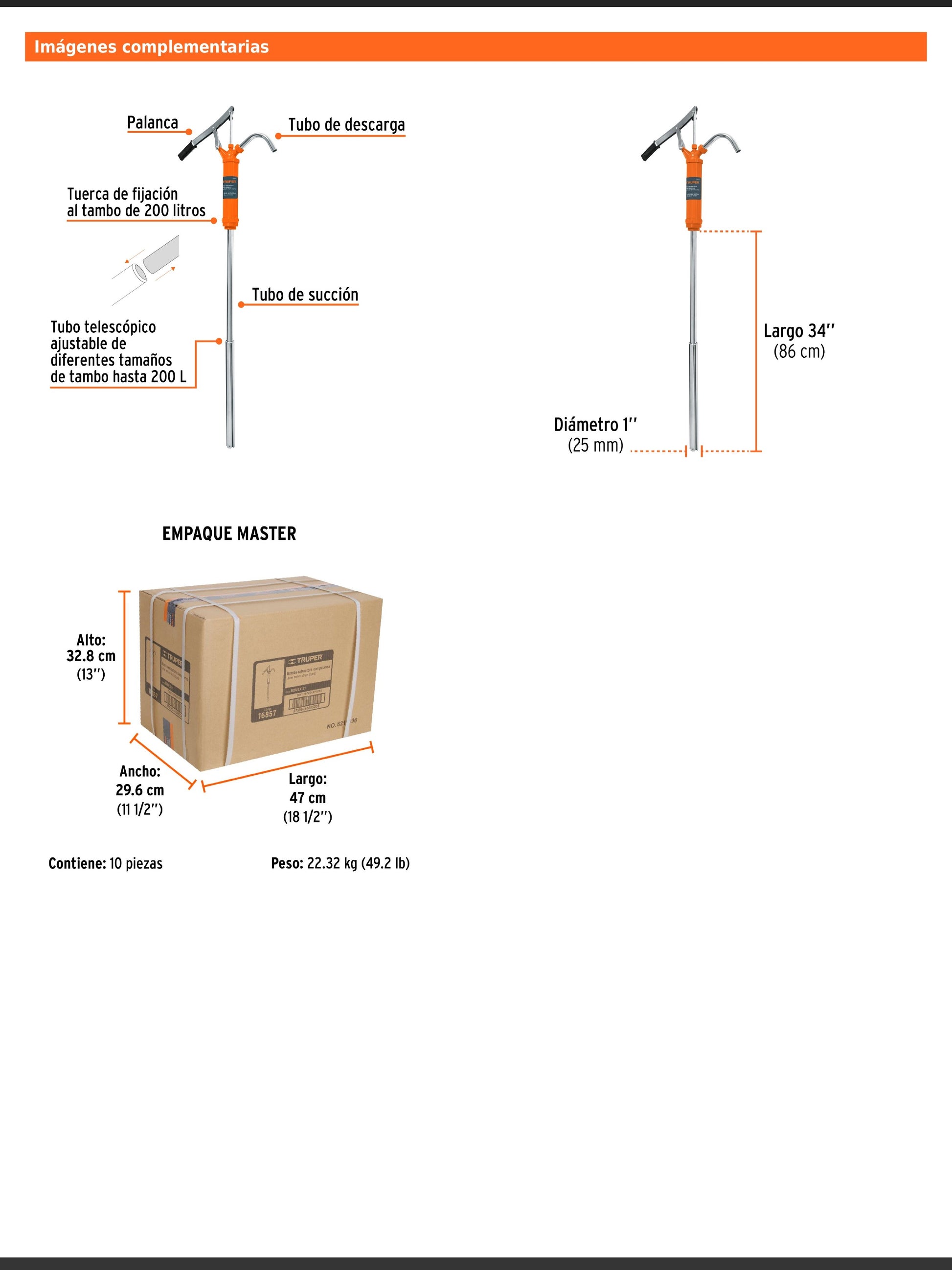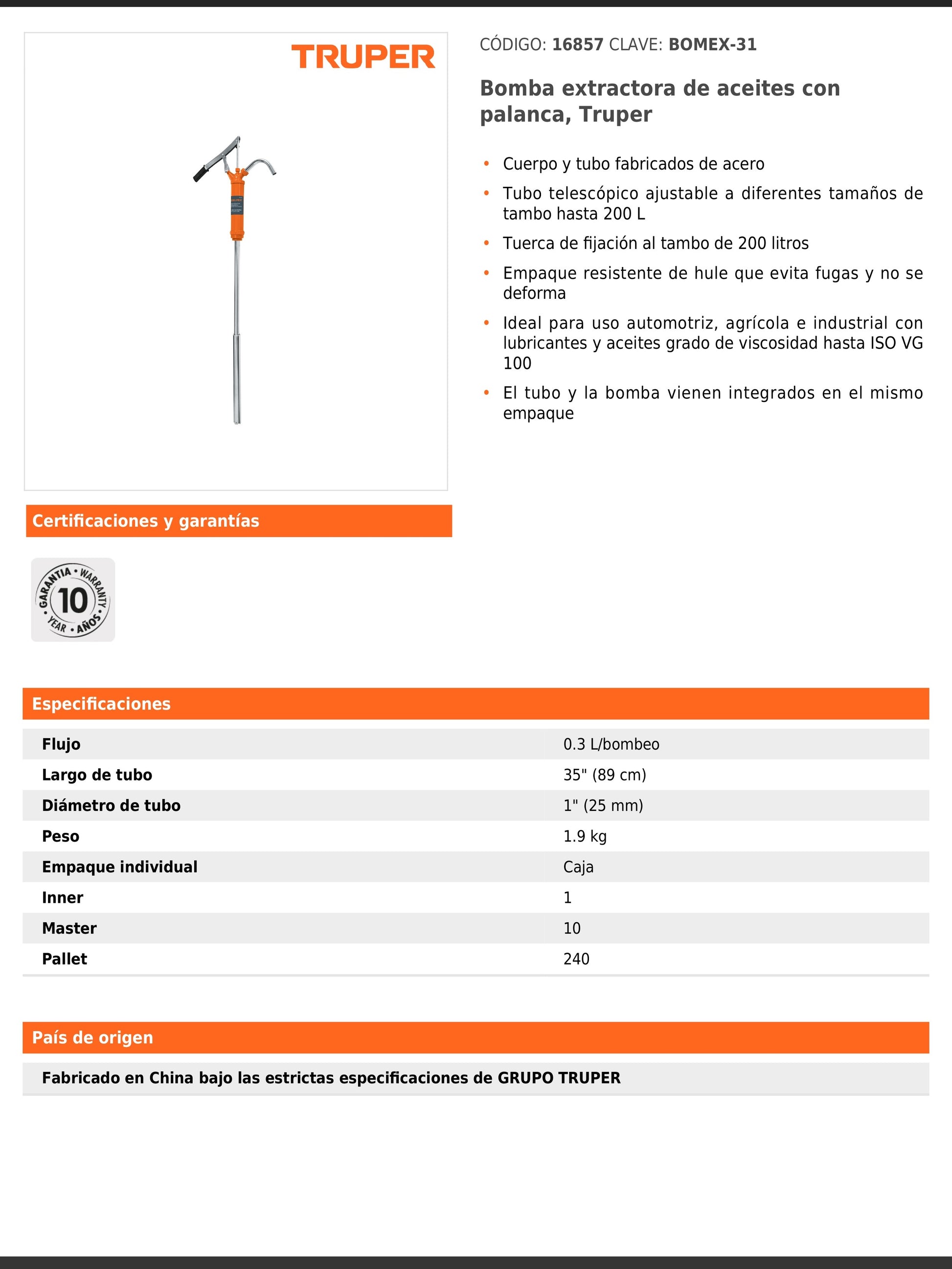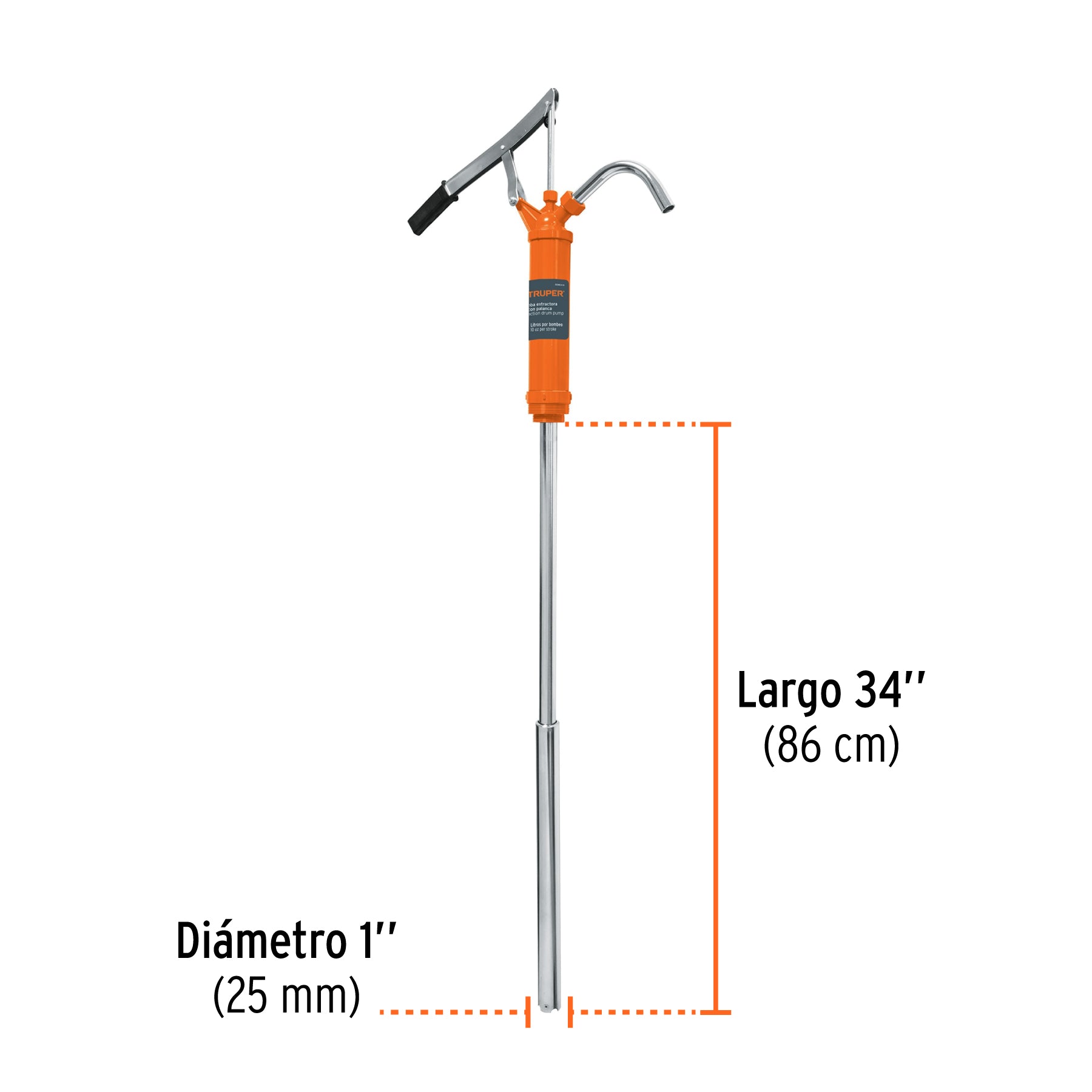 Bomba manual con cuerpo y tubo de acero, equipada con tubo telescópico ajustable a diferentes tamaños de tambo hasta 200 litros. Cuenta con tuerca de fijación y empaque de hule resistente que evita fugas y no se deforma. Es ideal para uso automotriz, agrícola e industrial con lubricantes y aceites de viscosidad hasta ISO VG 100. El tubo y la bomba vienen integrados en el mismo empaque para mayor practicidad.