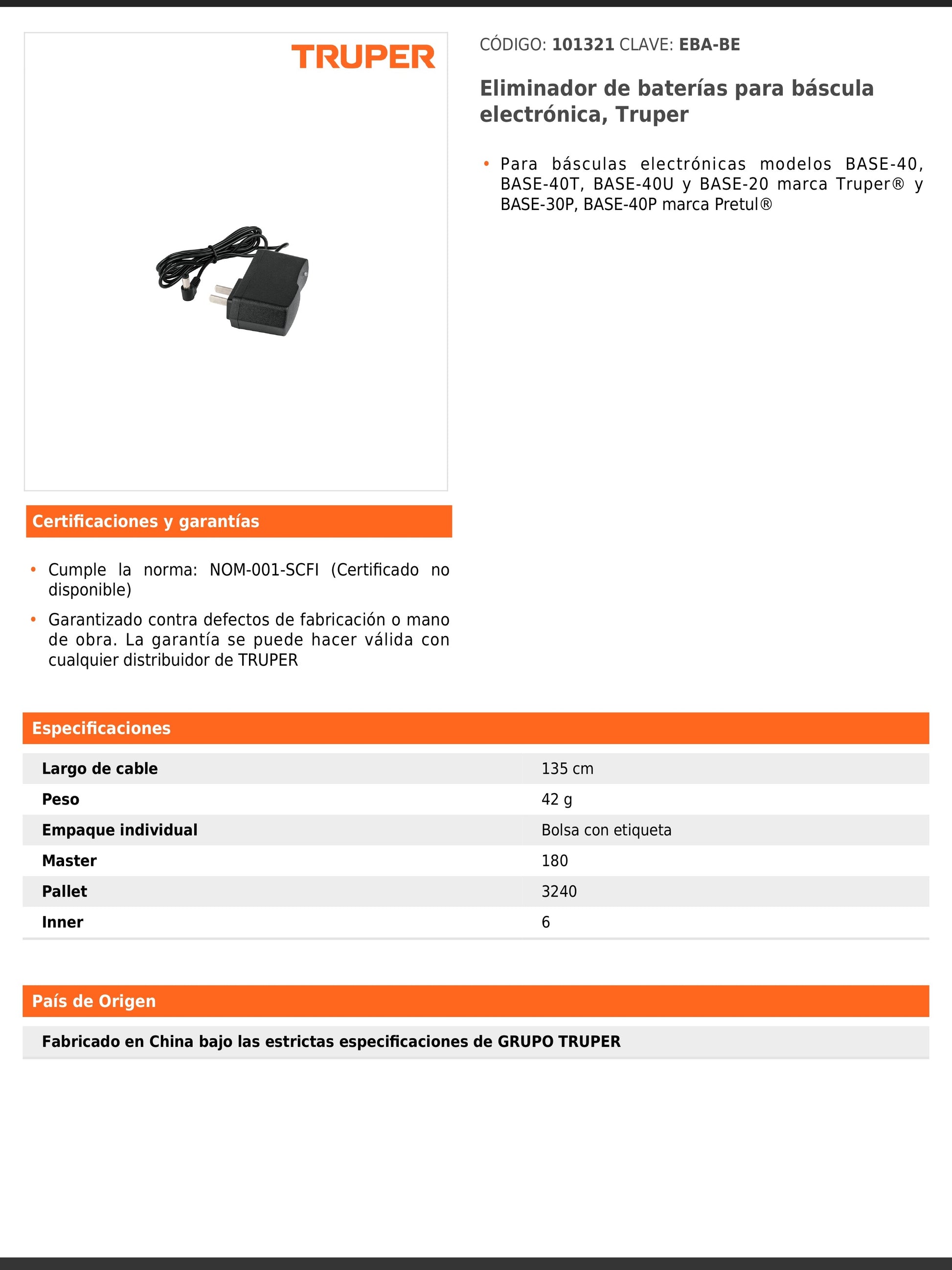 Eliminador de baterías para básculas electrónicas modelos BASE-40, BASE-40T, BASE-40U y BASE-20 de la marca Truper, y modelos BASE-30P y BASE-40P de la marca Pretul. Incluye cable de 135 cm, peso de 42 g y cumple con la norma NOM-001-SCFI.