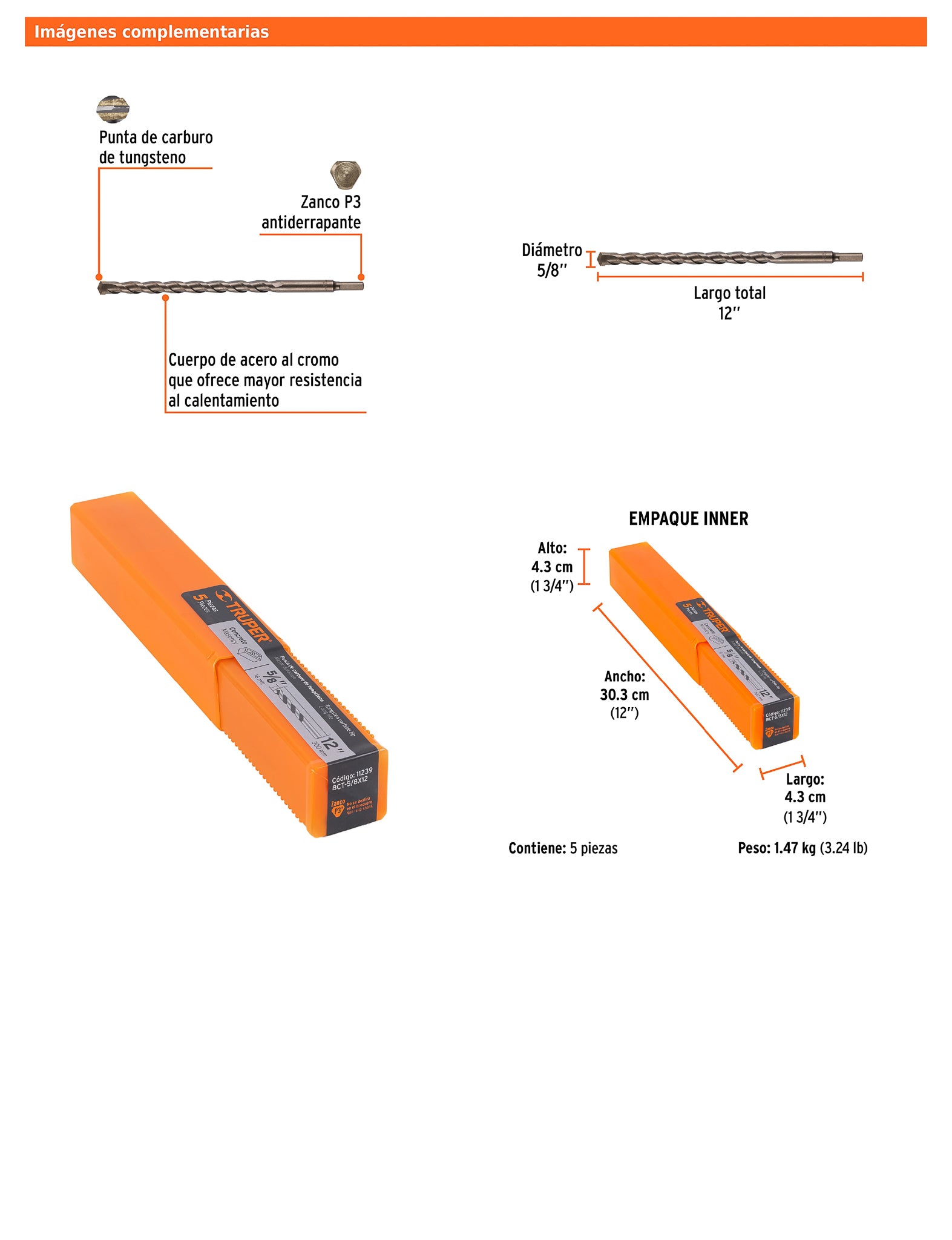 Compatible con rotomartillos y broqueros de mordaza, ideal para perforar concreto y ladrillo. Incluye caja telescópica plástica que protege el producto y facilita su almacenamiento.