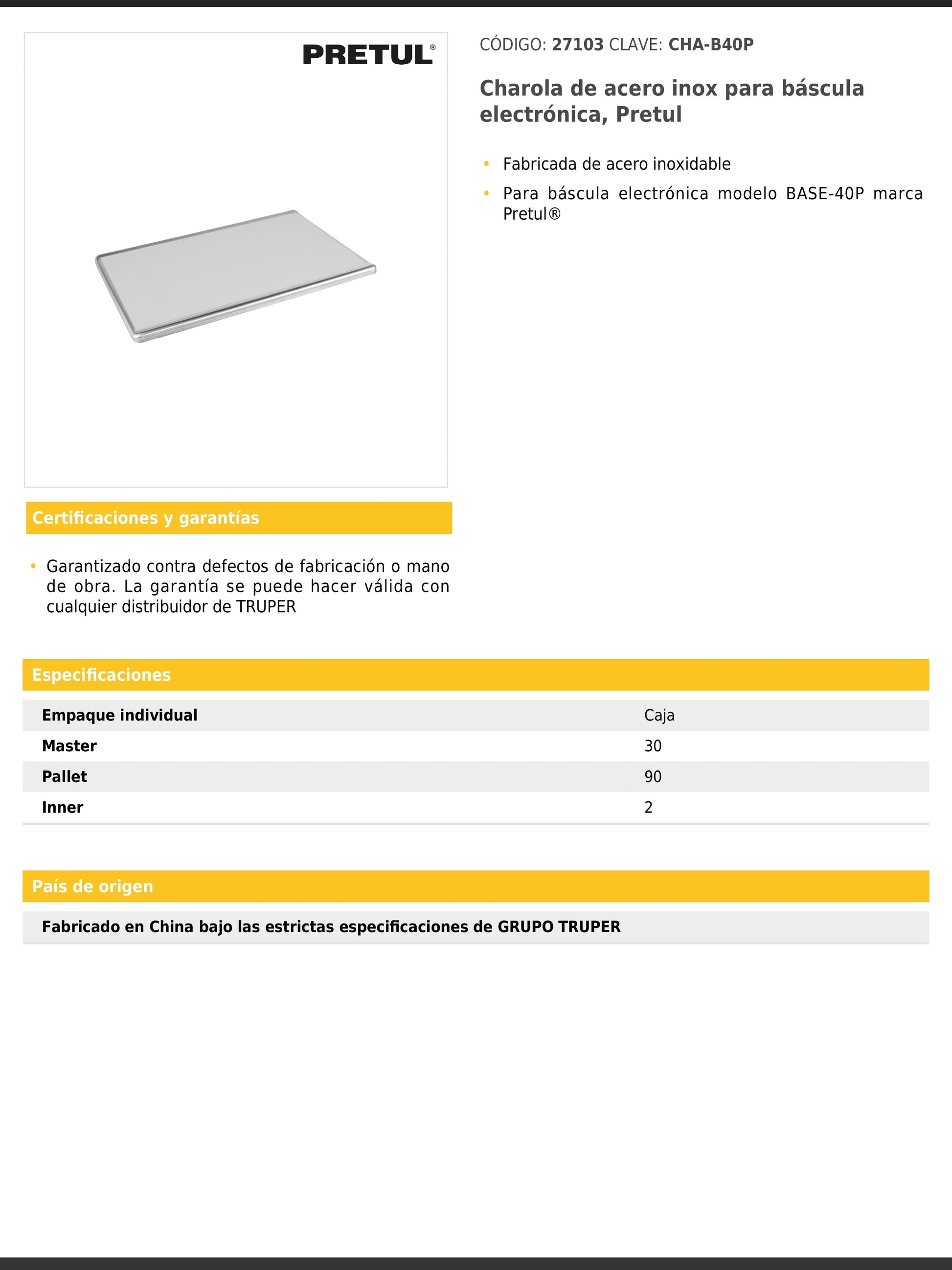Charola fabricada en acero inoxidable para báscula electrónica modelo BASE-40P marca Pretul. Ofrece resistencia, durabilidad y fácil limpieza, ideal para aplicaciones comerciales y de pesaje.