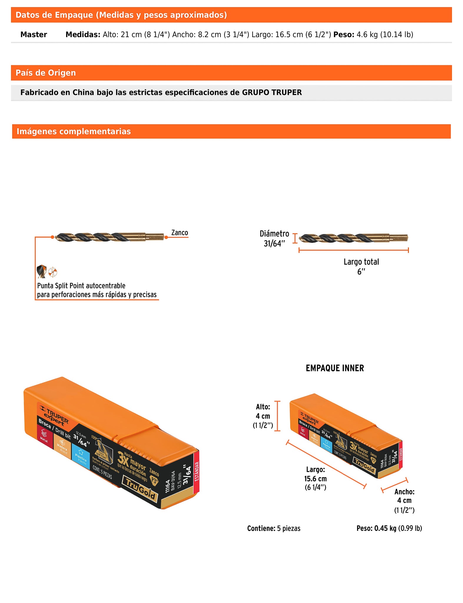 Broca HSS 31/64 pulg Trugold para metal con punta Split Point