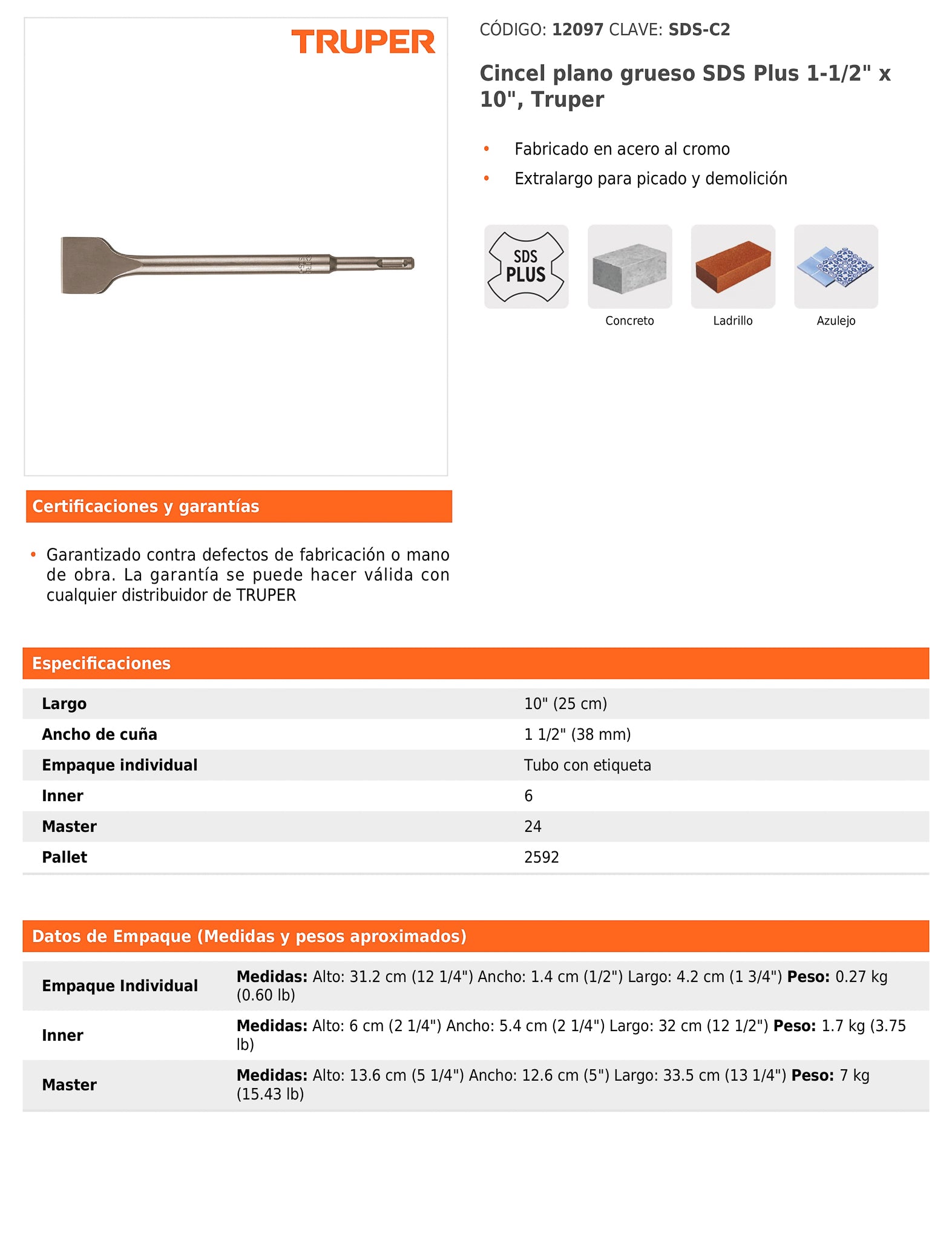Diseñado para trabajos exigentes de picado y demolición en concreto, ladrillo o azulejo. Fabricado en acero al cromo de alta resistencia, su diseño extralargo ofrece mayor alcance y eficiencia en cada golpe. Ideal para uso profesional con sistemas SDS Plus.