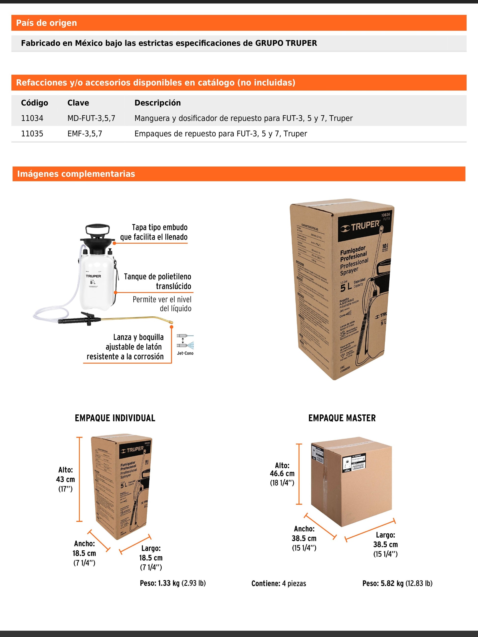 Fumigador de 5 litros con tanque de polietileno translúcido que permite ver el nivel del líquido. Incluye lanza y boquilla ajustable de latón resistente a la corrosión, pistola con seguro para rocío continuo y válvula de liberación de presión. Cuenta con tapa tipo embudo que facilita el llenado y manguera reforzada con conexión desmontable para una fácil limpieza.