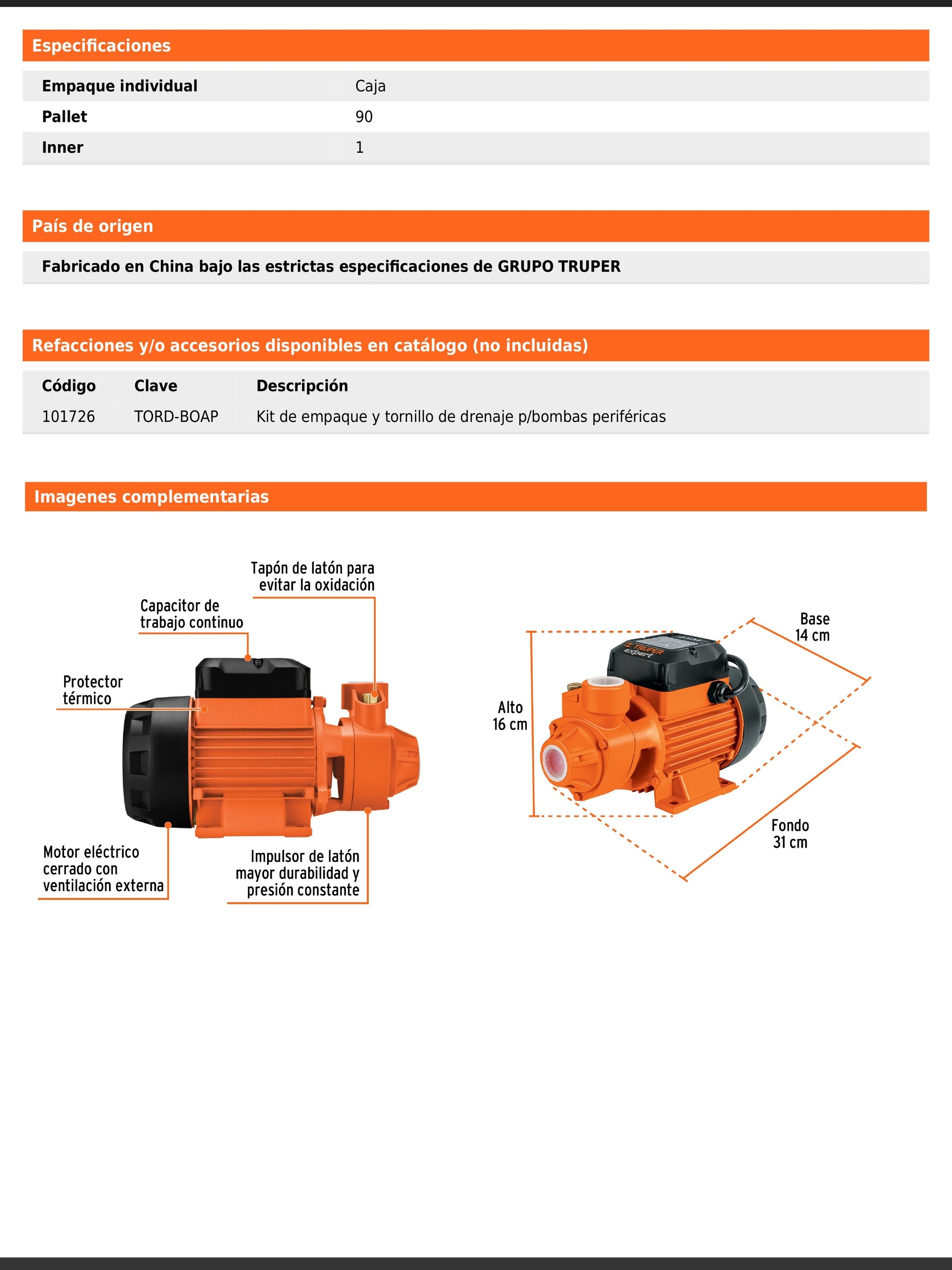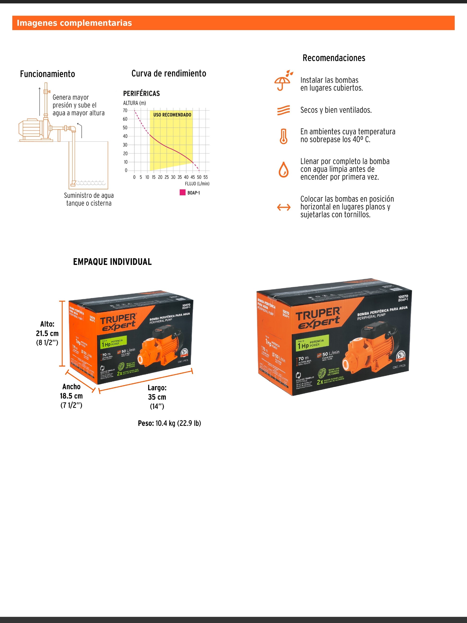 Bomba periférica de 1 HP agrícola que ofrece mayor altura para subir agua a lugares altos. Tiene altura máxima de 70 m, flujo máximo de 50 L/min, profundidad de succión de 8 m, impulsor de latón, motor con embobinado de cobre, velocidad de 3,450 rpm, consumo de 10.4 A, protección IPX4, ciclo de trabajo de 50 min por 20 min de descanso, temperatura máxima del líquido 40 °C y cumple con la norma NOM-003-SCFI.