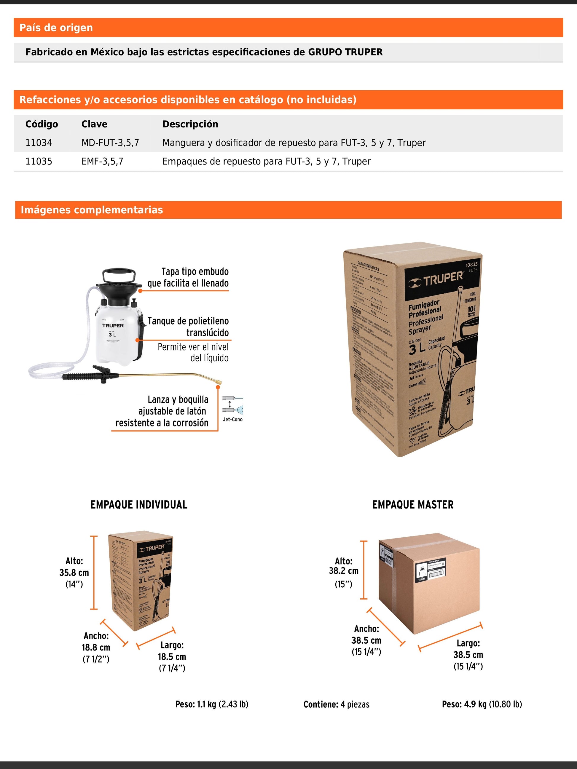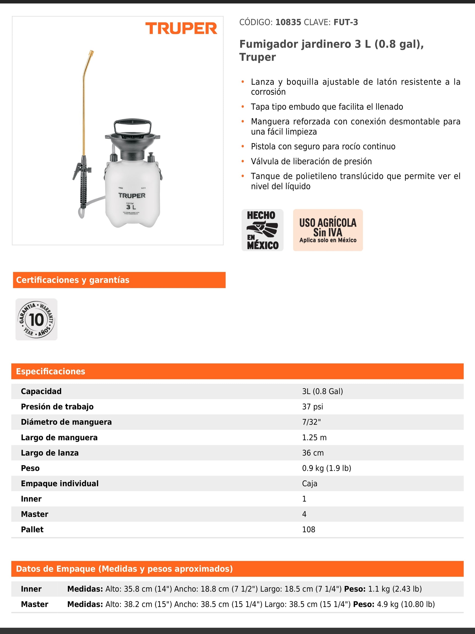 Cuenta con lanza y boquilla ajustable de latón resistente a la corrosión. Incluye tapa tipo embudo para facilitar el llenado, manguera reforzada con conexión desmontable, pistola con seguro para rocío continuo y válvula de liberación de presión. Su tanque de polietileno translúcido permite visualizar el nivel del líquido. Compatible con refacciones y accesorios disponibles en catálogo.