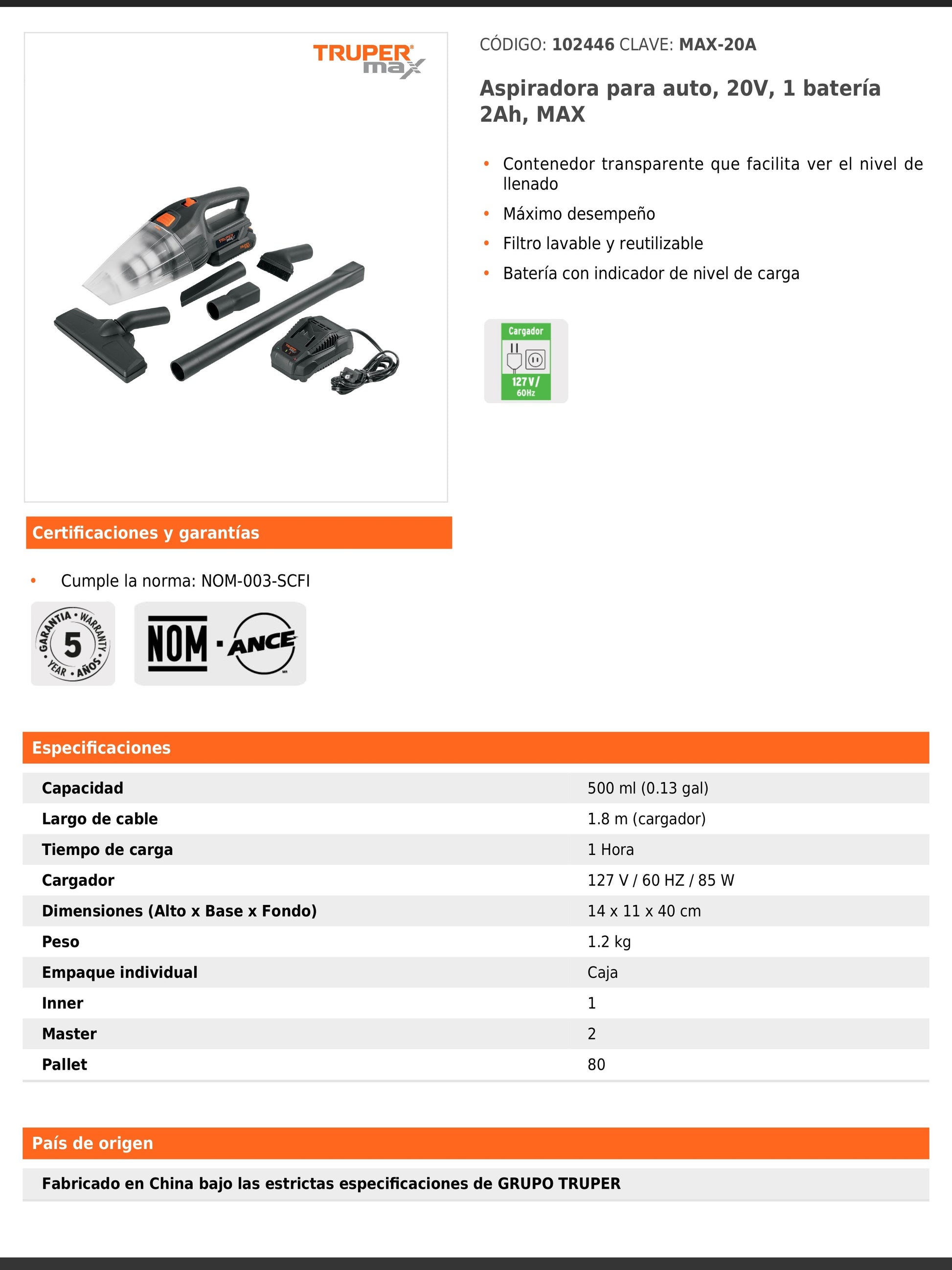 Aspiradora para auto de 20 V con batería de 2 Ah