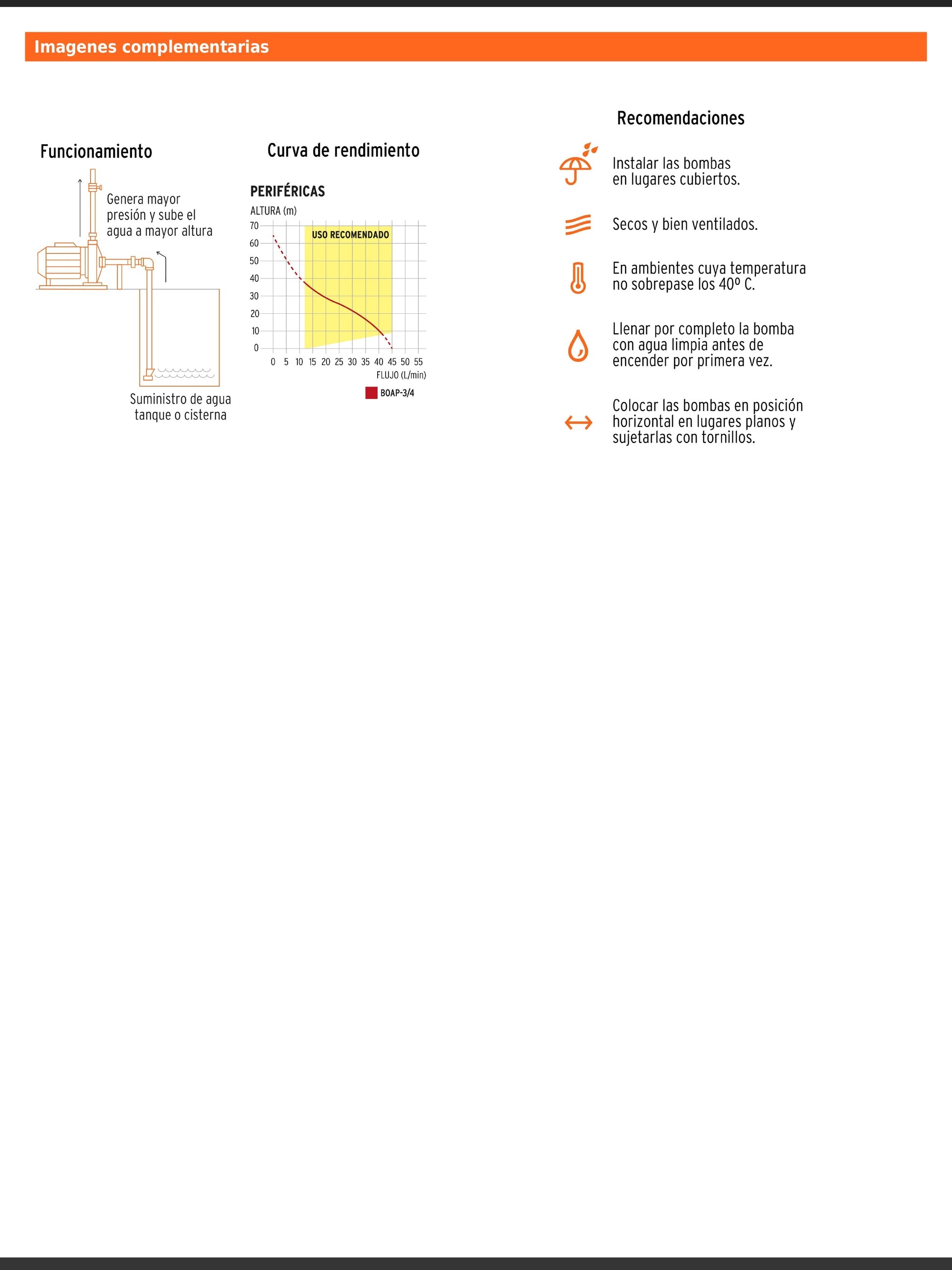Tiene altura máxima de 65 m, flujo máximo de 45 L/min, profundidad de succión de 8 m, impulsor de latón, motor con embobinado de cobre, velocidad de 3,450 rpm, consumo de 7.2 A, protección IPX4, ciclo de trabajo de 50 min por 20 min de descanso, temperatura máxima del líquido 40 °C y cumple con la norma NOM-003-SCFI.