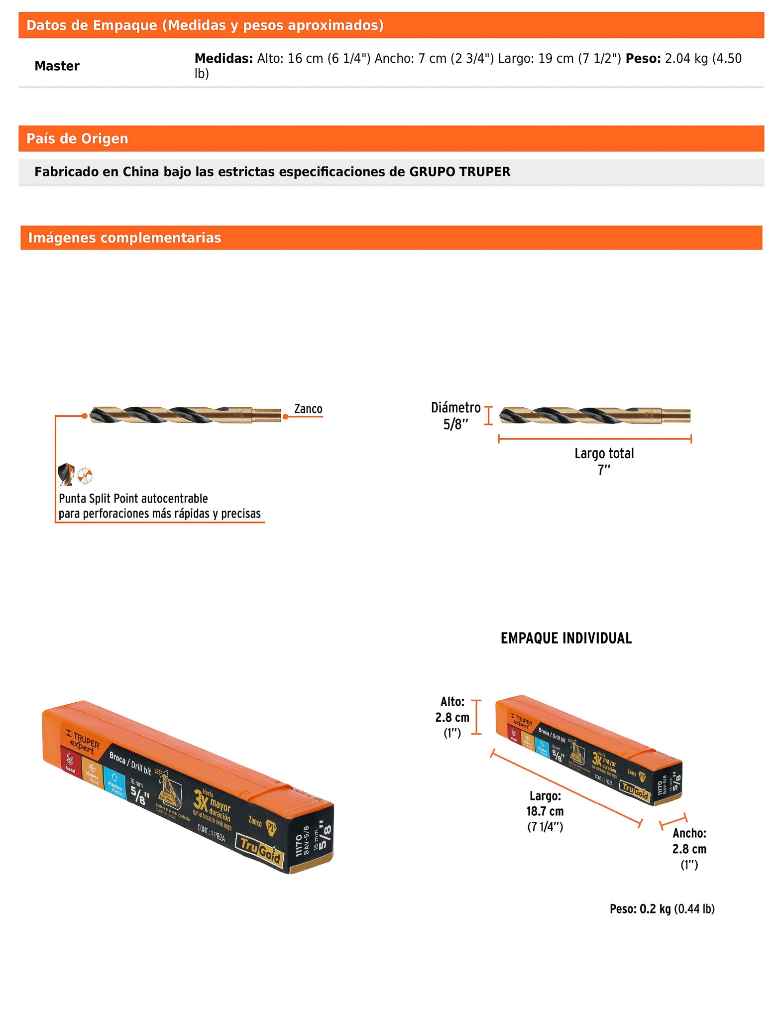 Broca HSS 5/8 pulg Trugold para metal con punta Split Point