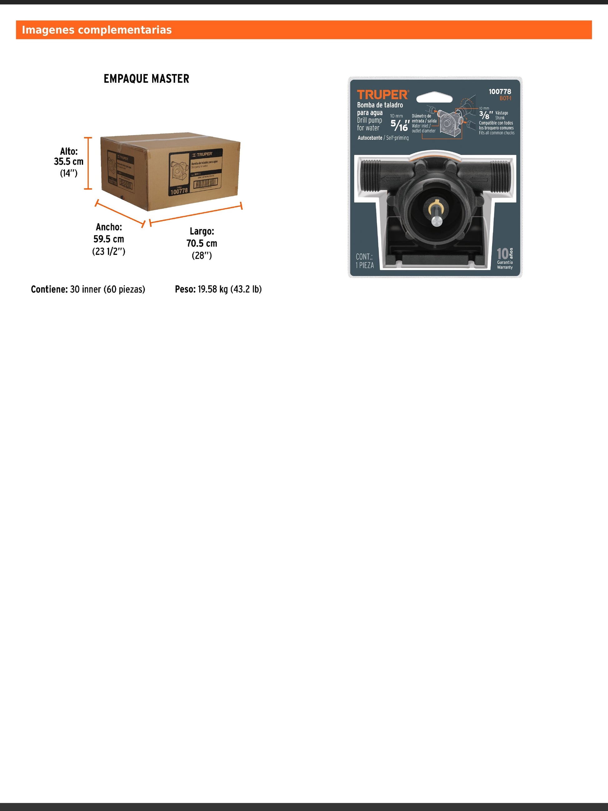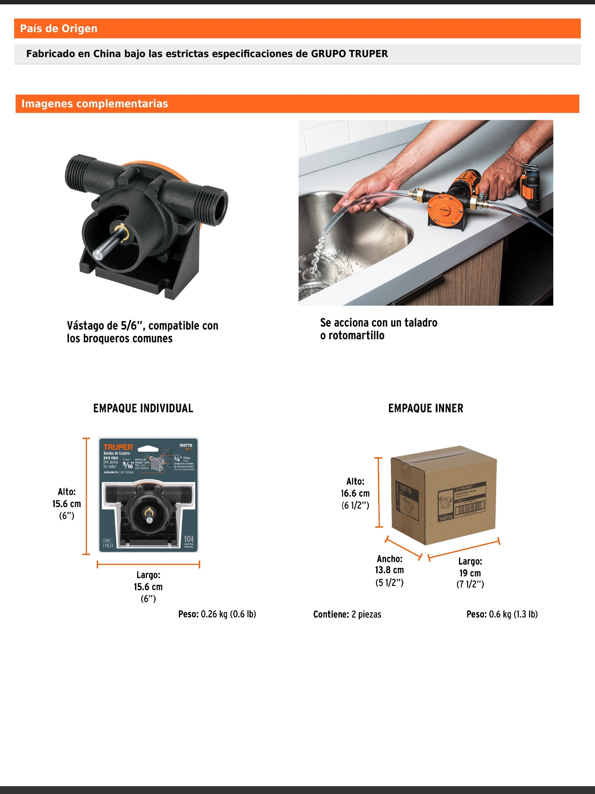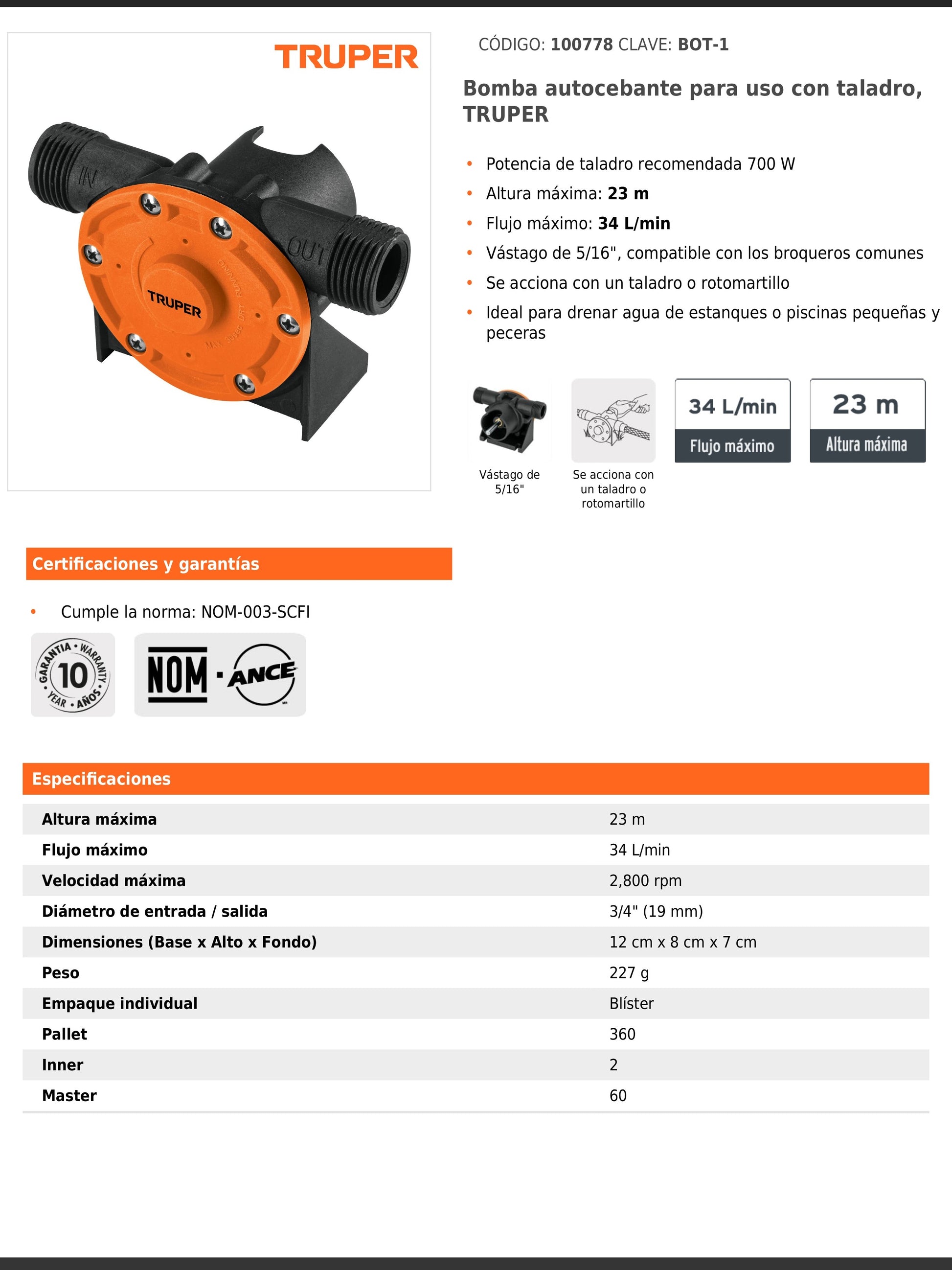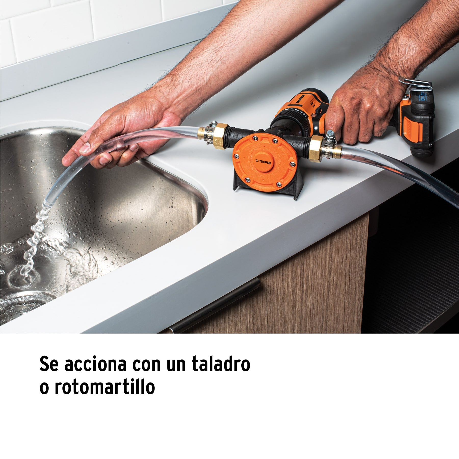 Bomba autocebante para uso con taladro, recomendada para potencias de 700 W. Tiene altura máxima de 23 m, flujo máximo de 34 L/min, velocidad máxima de 2,800 rpm, vástago de 5/16" compatible con broqueros comunes y diámetro de entrada/salida de 3/4".