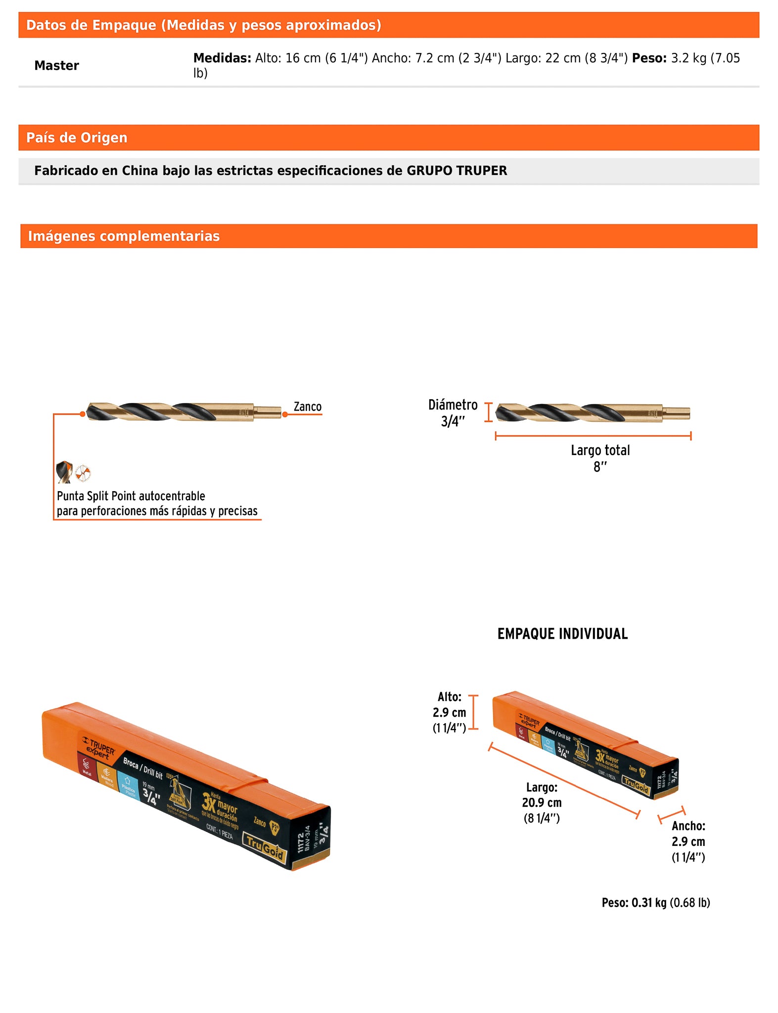 Broca HSS 3/4 pulg Trugold para metal con punta Split Point