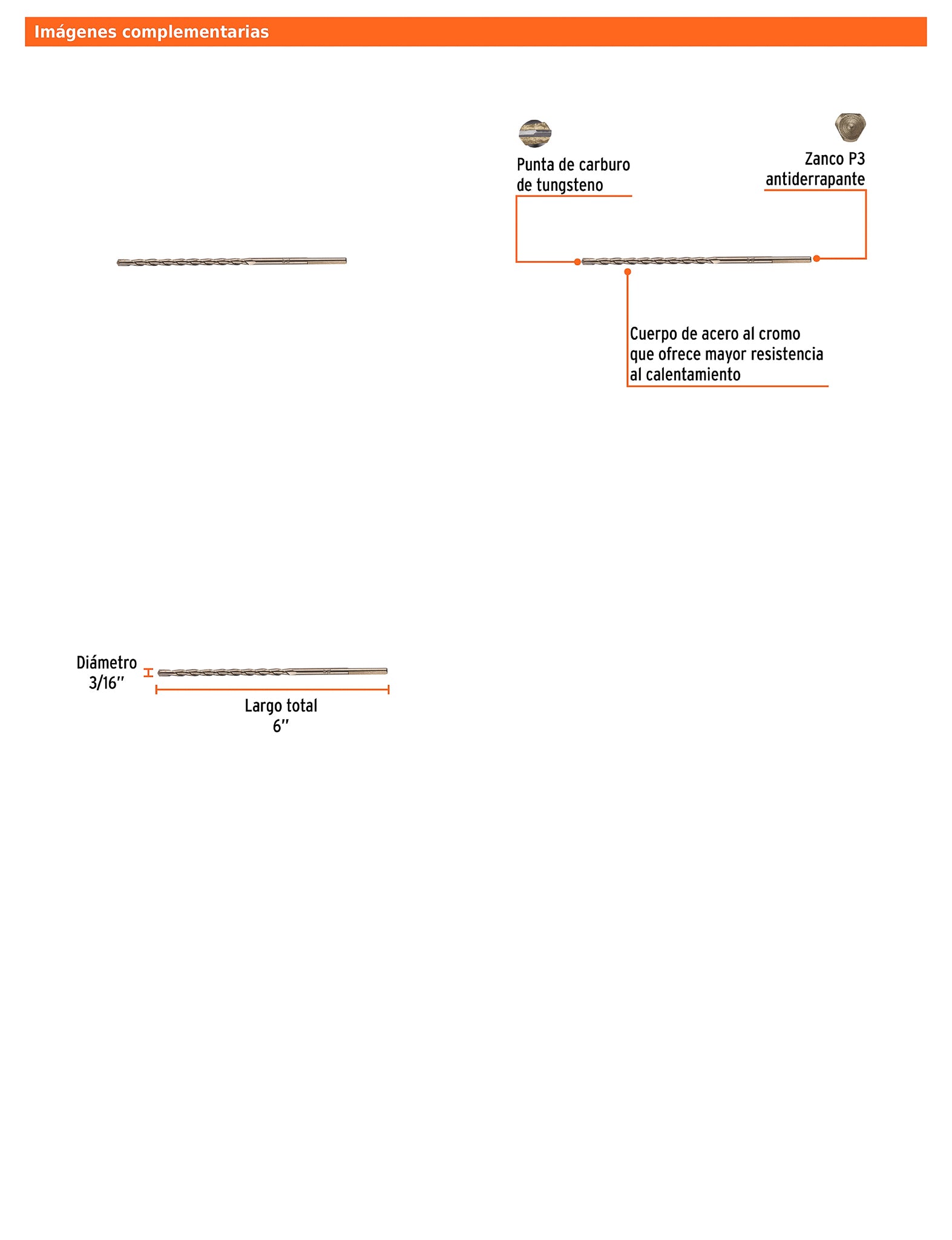 Broca para concreto de 3/16 x 6 in con punta de carburo de tungsteno