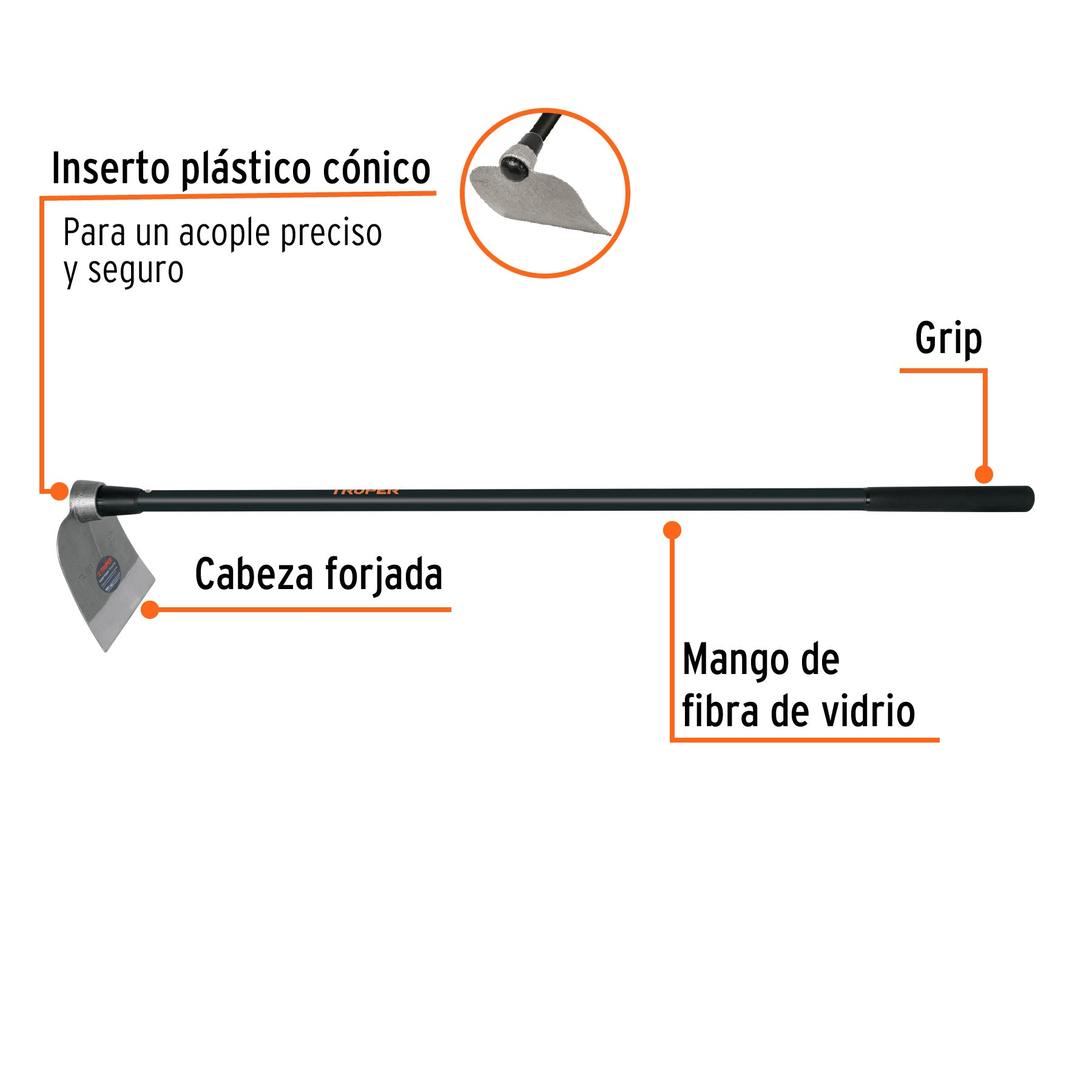 Azadón Centroamericano con cabeza forjada en una sola pieza y nervio central que brinda mayor resistencia al impacto y reduce la vibración. Tiene acabado pulido y preafilado, acompañado de mango de fibra de vidrio más resistente que la madera, con inserto cónico para acople preciso y mayor seguridad. Ideal para aflojar y preparar el terreno para la siembra. De uso agrícola y hortícola, garantizado contra defectos de fabricación o mano de obra con cualquier distribuidor autorizado.