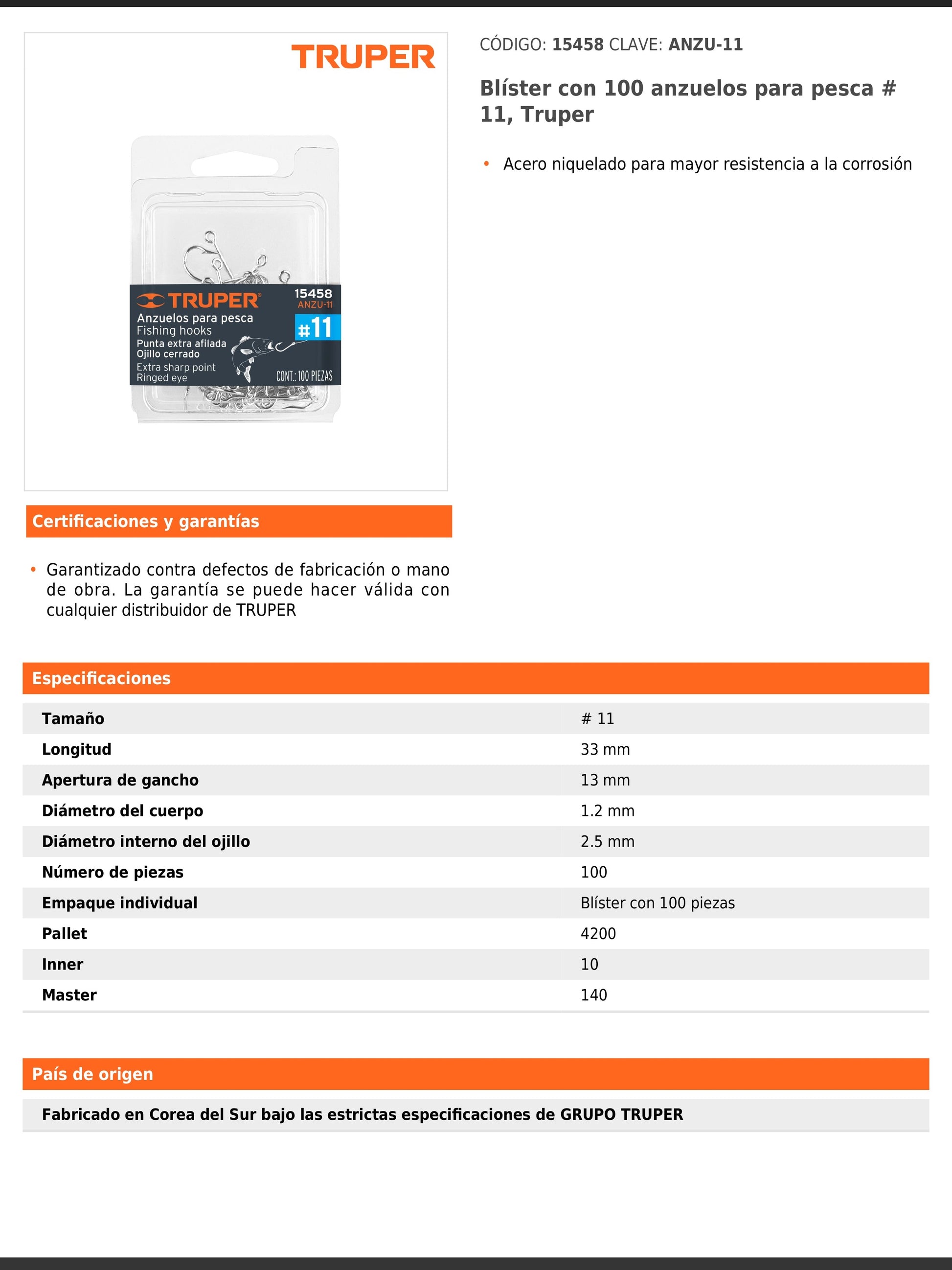 Anzuelos fabricados en acero niquelado para brindar mayor resistencia a la corrosión y prolongar su durabilidad en distintas condiciones de pesca. El blíster contiene 100 piezas prácticas y confiables.
