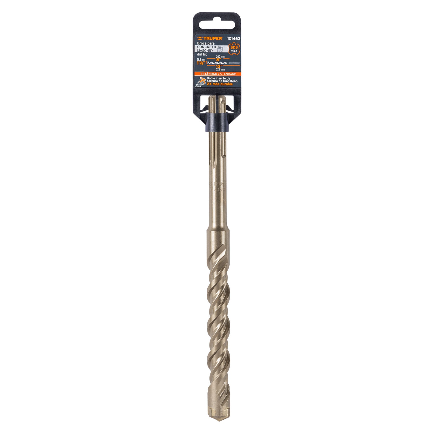 Broca SDS max de 1-1/8" x 13" con punta de cruz y doble inserto de carburo que ofrece perforaciones precisas y duraderas, duplicando la vida útil frente a brocas convencionales. Su cuerpo fabricado en acero al cromo mejora la resistencia al calentamiento, mientras que su doble flauta incrementa la velocidad de perforación y la expulsión del material, ideal para trabajos en concreto con rotomartillos SDS max.