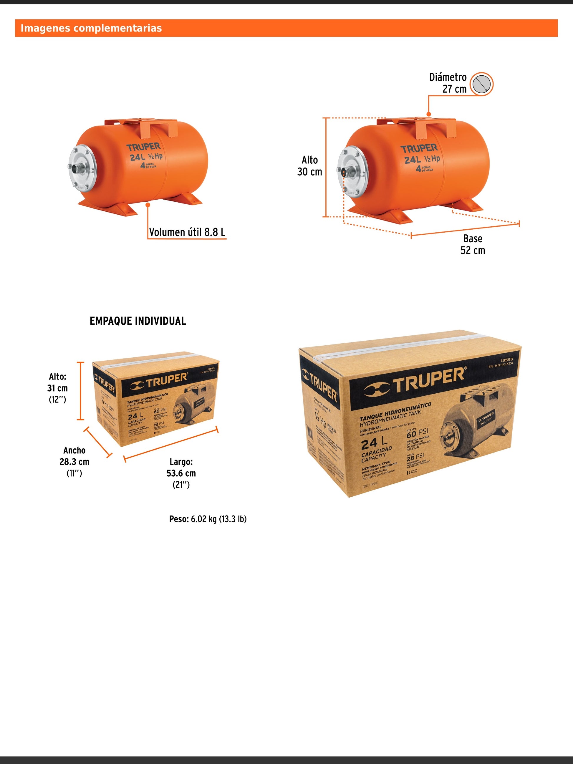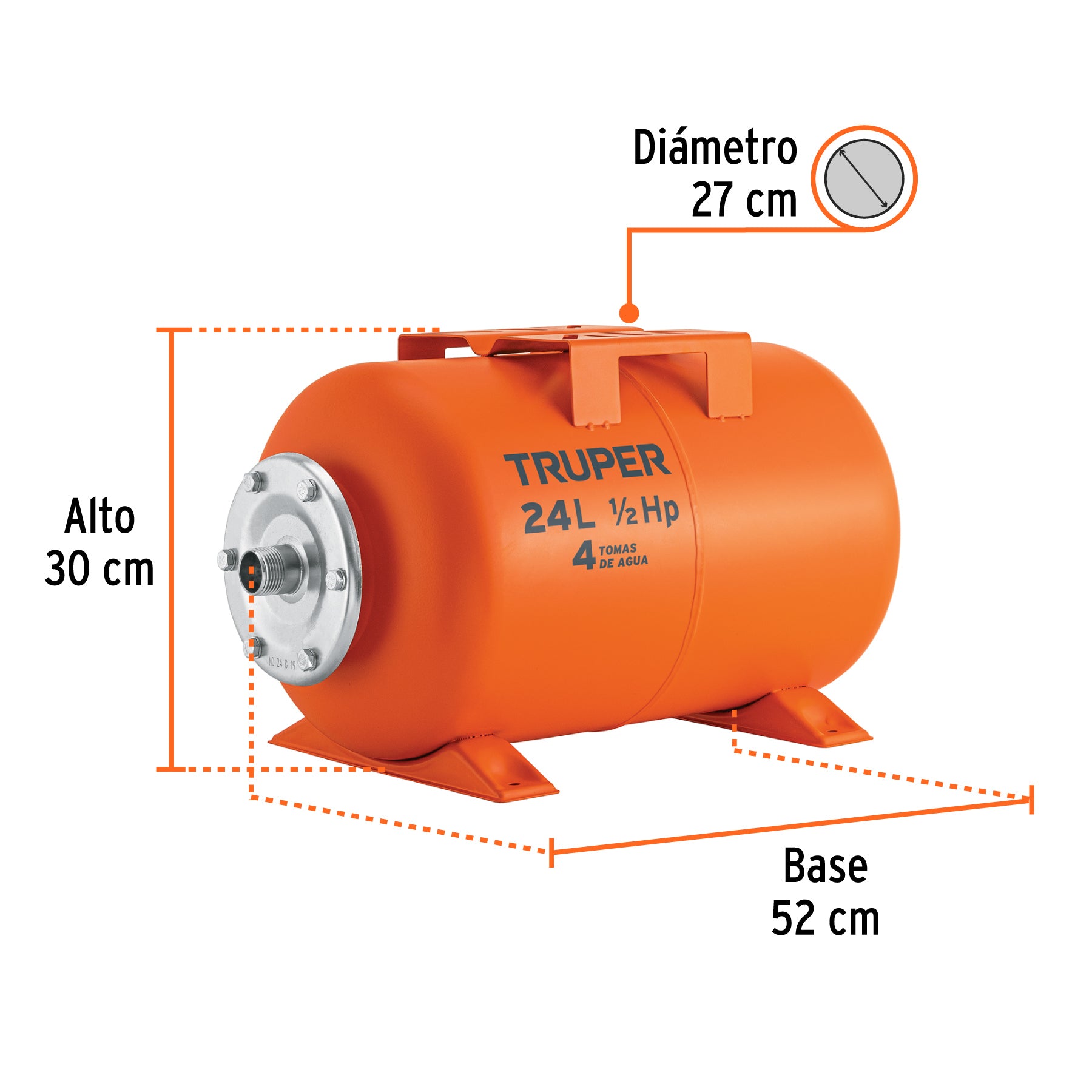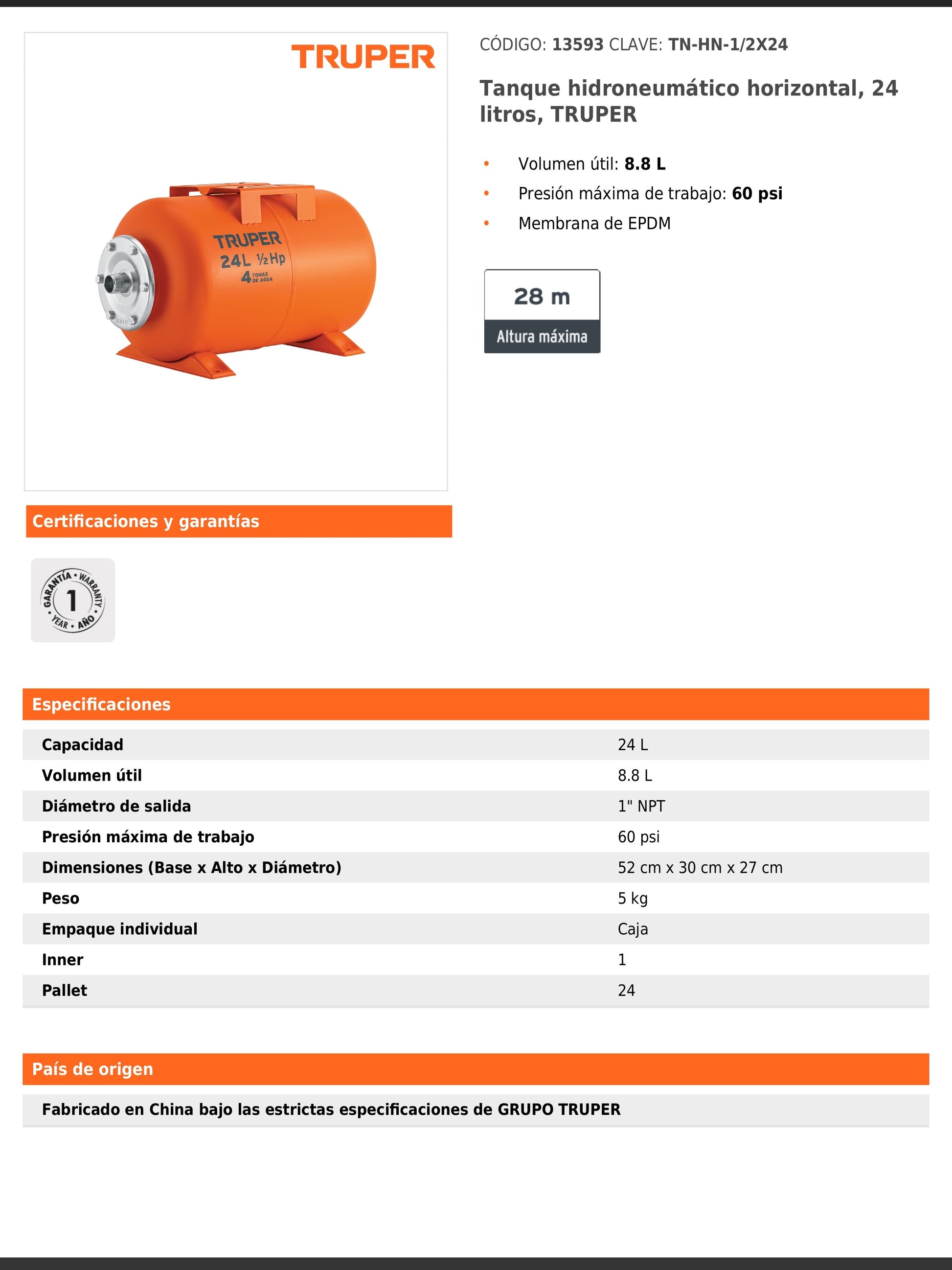 Tanque hidroneumático horizontal con capacidad de 24 litros y volumen útil de 8.8 litros. Está equipado con membrana de EPDM y soporta una presión máxima de trabajo de 60 psi. Su diseño compacto y resistente garantiza un rendimiento confiable en sistemas de agua a presión.
