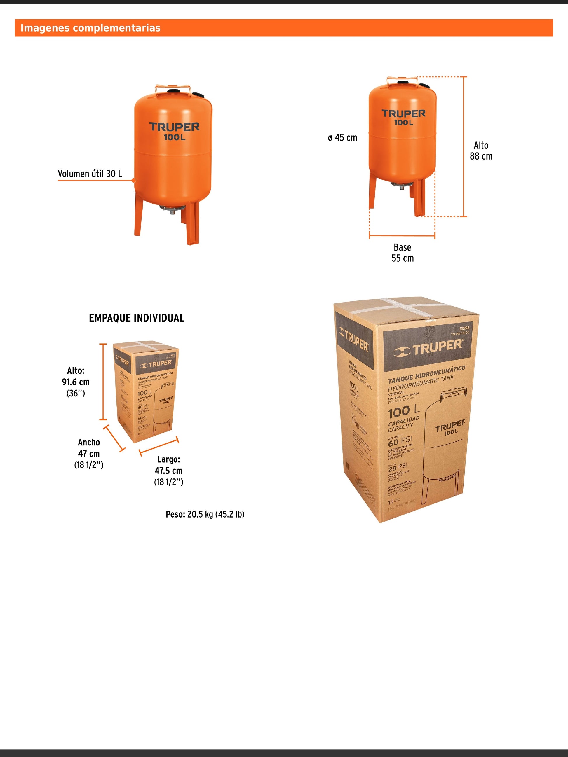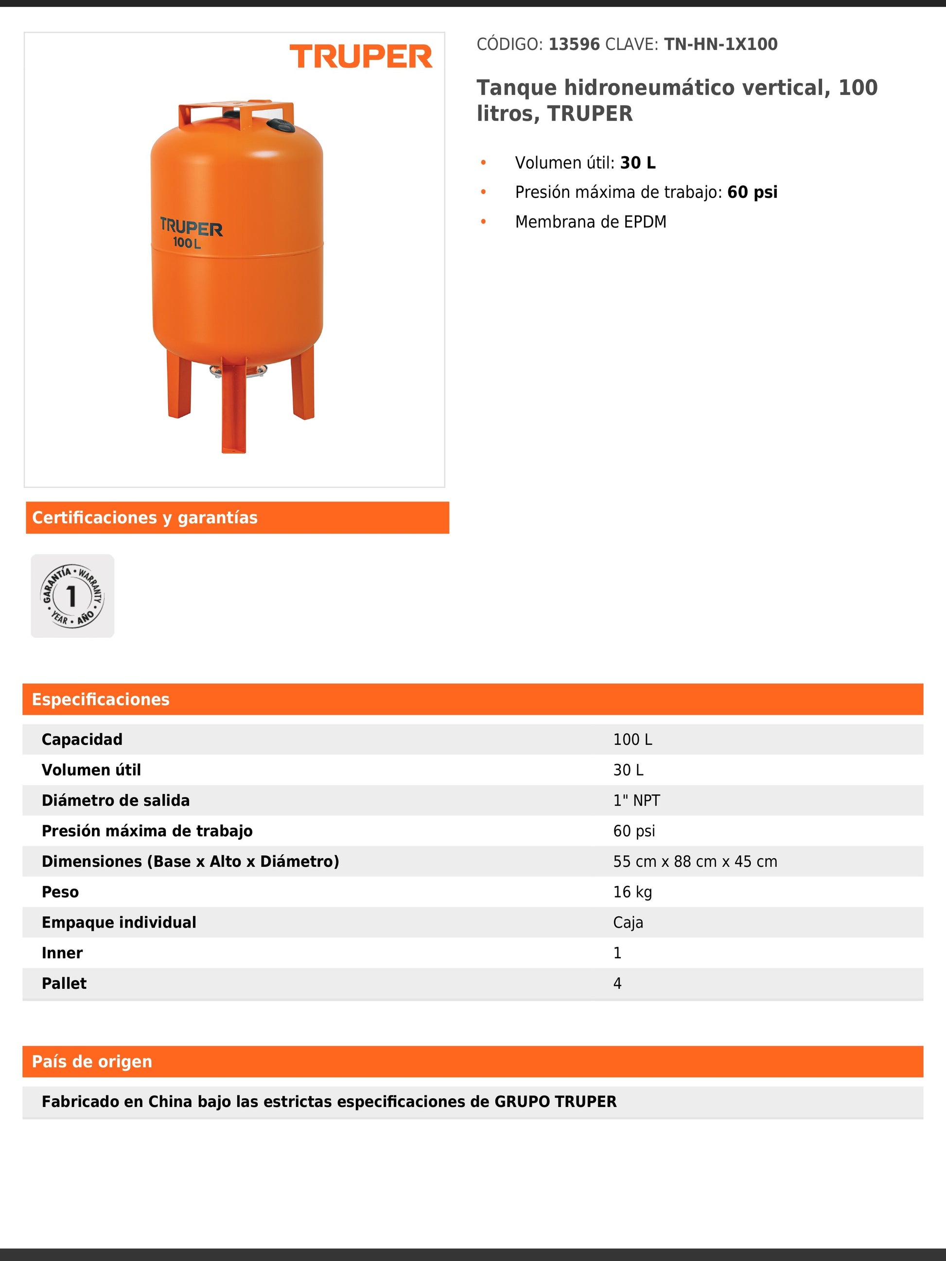 Tanque hidroneumático vertical con capacidad de 100 litros y volumen útil de 30 litros. Fabricado con membrana de EPDM y diseñado para soportar una presión máxima de trabajo de 60 psi. Su estructura resistente asegura un desempeño confiable en sistemas de agua a presión.