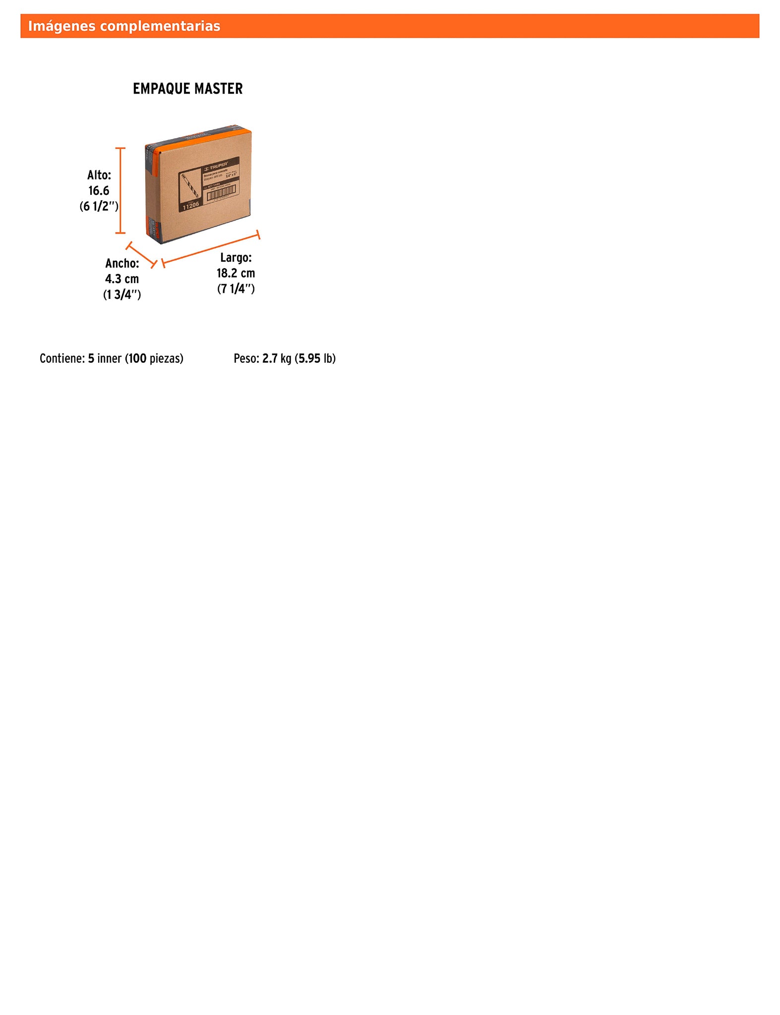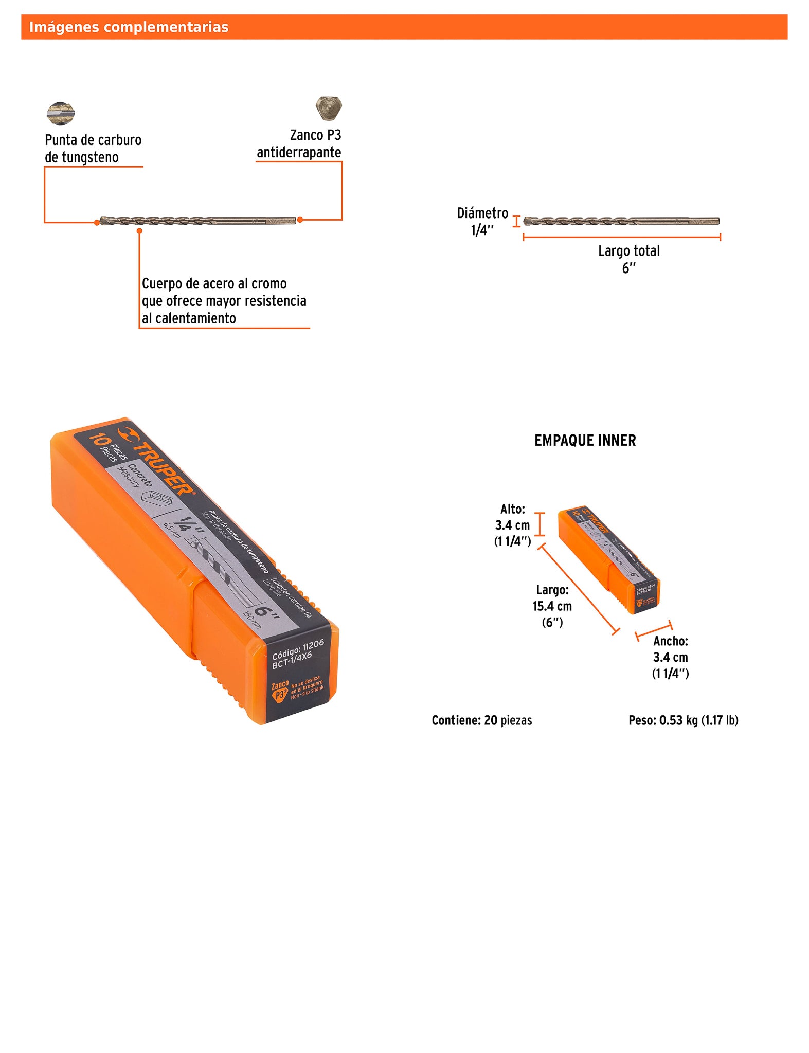 Compatible con rotomartillos y broqueros de mordaza, ideal para perforar concreto y ladrillo. Incluye caja telescópica plástica que protege la broca y facilita su almacenamiento.