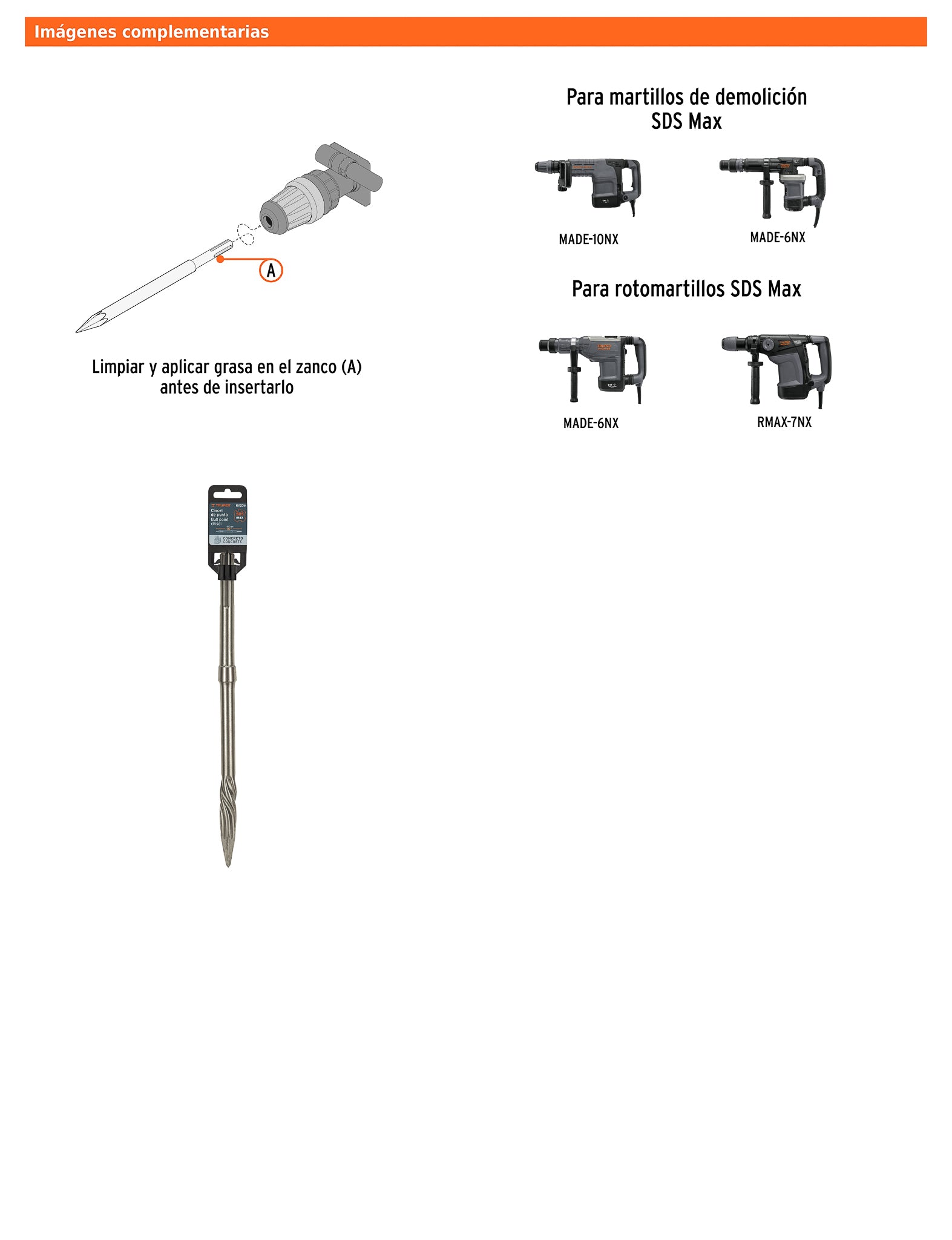 Cincel de punta de 16" fabricado en acero al cromo para máxima durabilidad y resistencia en trabajos de demolición, perforación o picado. Su diseño extra largo proporciona un mayor alcance y control, ideal para uso en concreto, ladrillo o azulejo con herramientas SDS max.