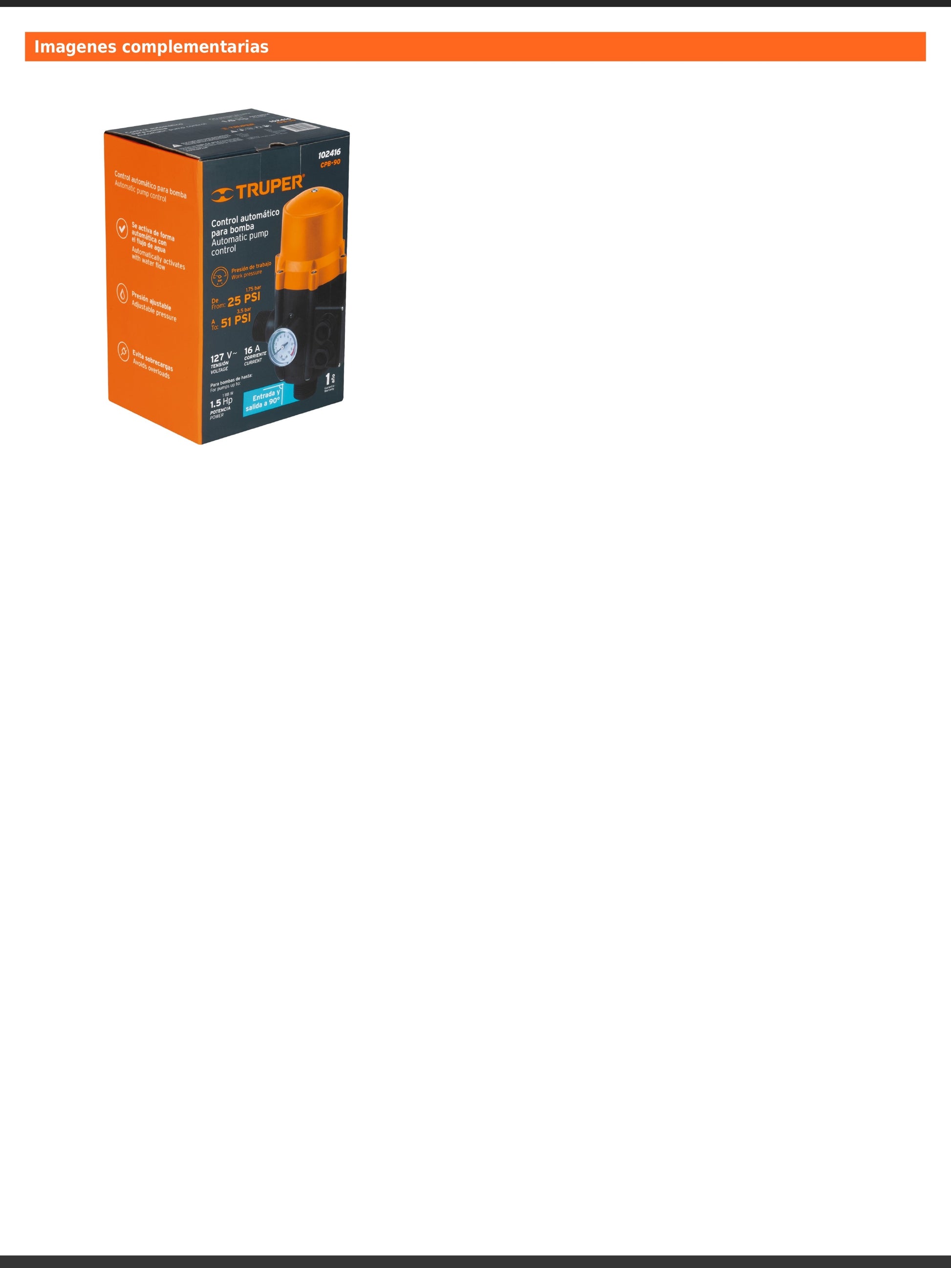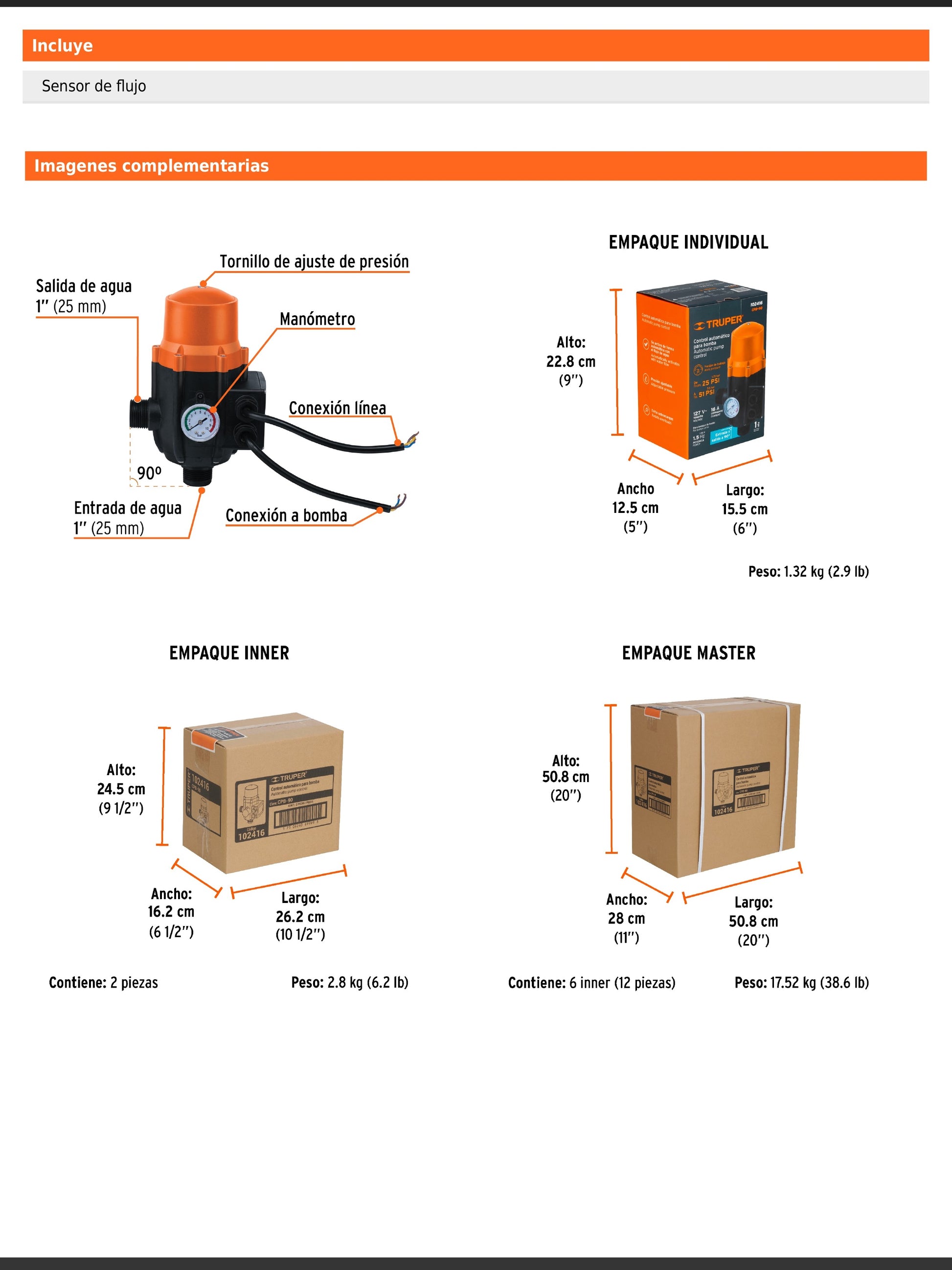 Control automático de presión diseñado para bombas periféricas, autocebantes, centrífugas, tipo jet, presurizadoras y multietapas de 1/2 hasta 1 1/2 HP (excepto sumergibles). Enciende automáticamente al detectar flujo de agua y protege contra funcionamiento en seco gracias a su sensor de flujo. Incorpora manómetro y luz LED indicadora, además de presión regulable para adaptarse a diferentes bombas.