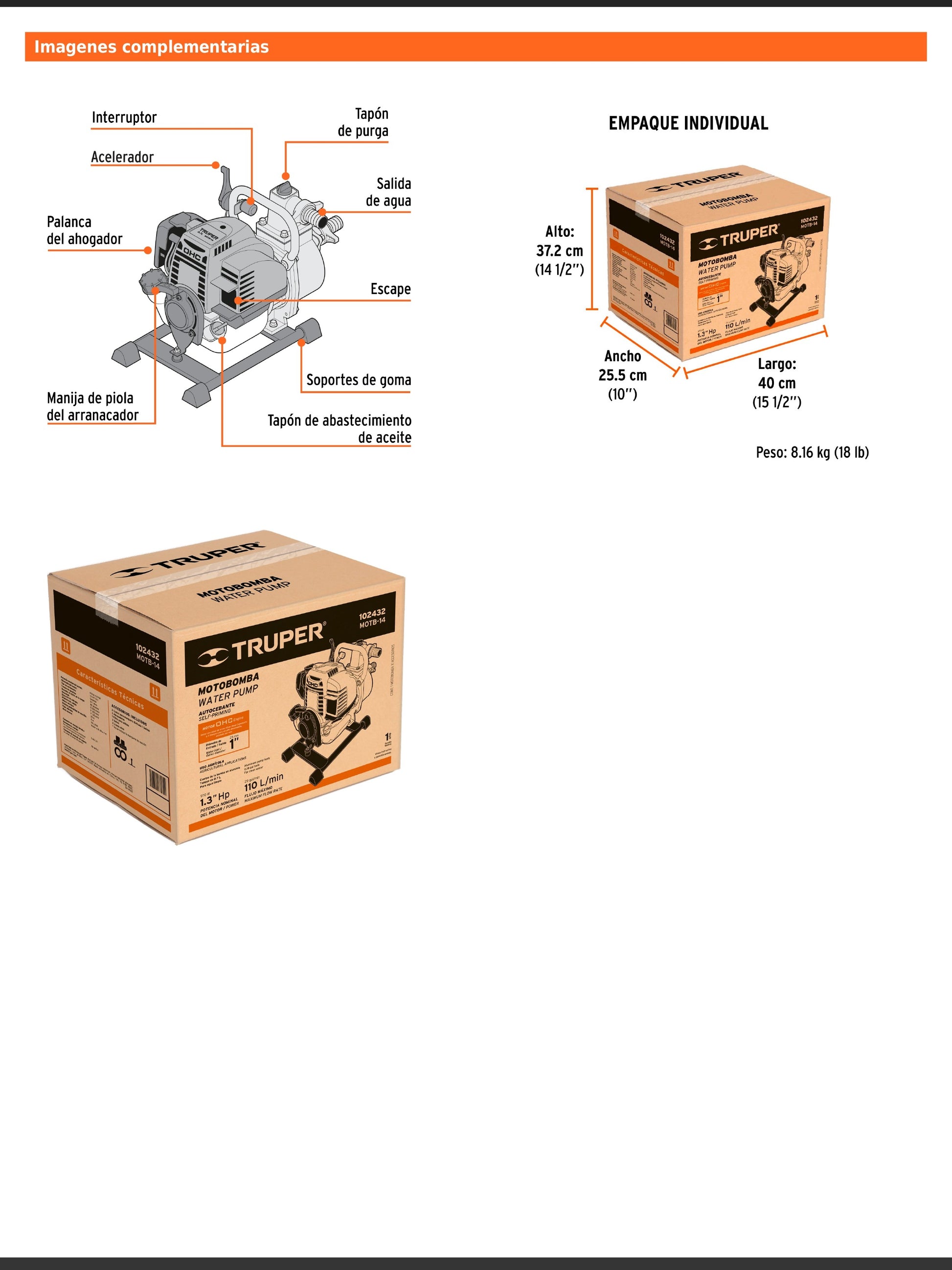 Motobomba autocebante de 1"x1" con motor a gasolina OHC de 4 tiempos de 1 1/3 HP, ideal para el traslado de grandes cantidades de agua limpia en zonas de difícil acceso a electricidad. Ofrece altura máxima de bombeo de 25 m, flujo máximo de 110 L/min y profundidad de succión de hasta 8 m. Incorpora carcasa de aluminio e impulsor de hierro, arranque manual con cuerda retráctil y tanque de 0.7 L con autonomía de 1.2 horas a carga completa. Compacta y ligera, diseñada para aplicaciones agrícolas.