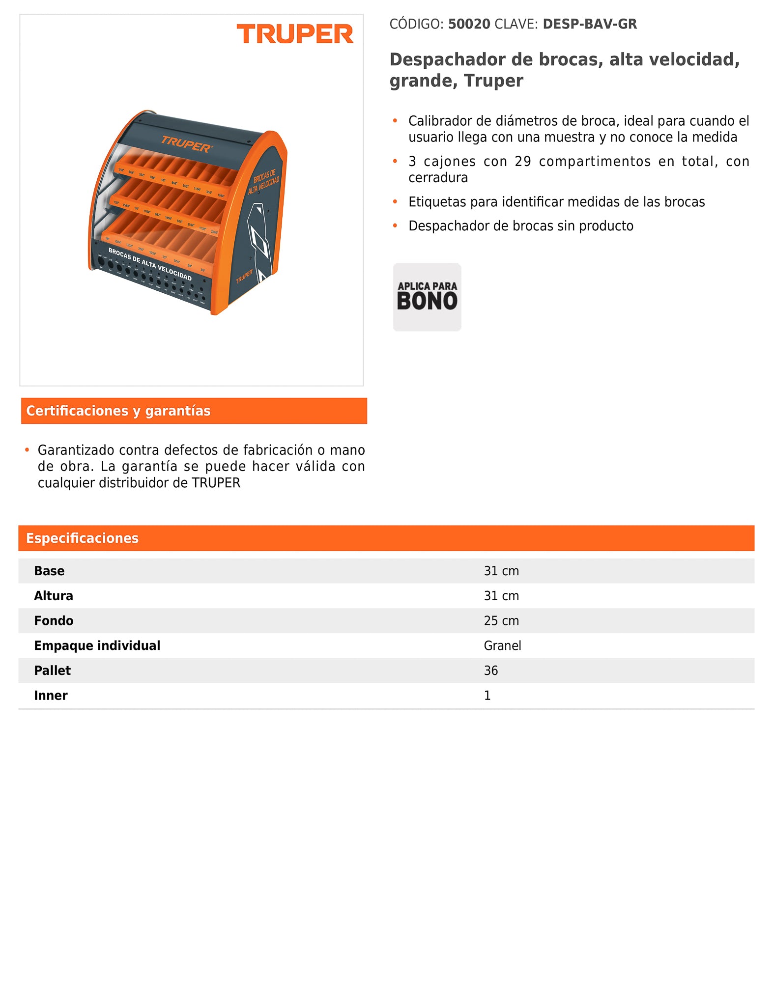 - Garantizado contra defectos de fabricación o mano de obra, con validez en distribuidores Truper.