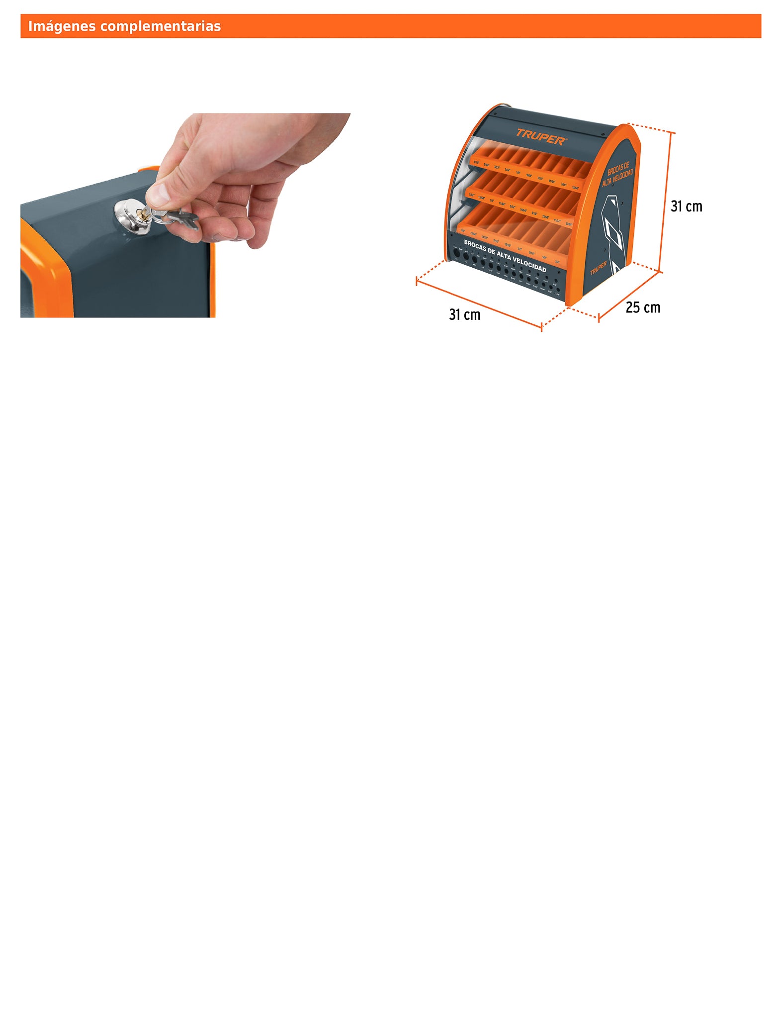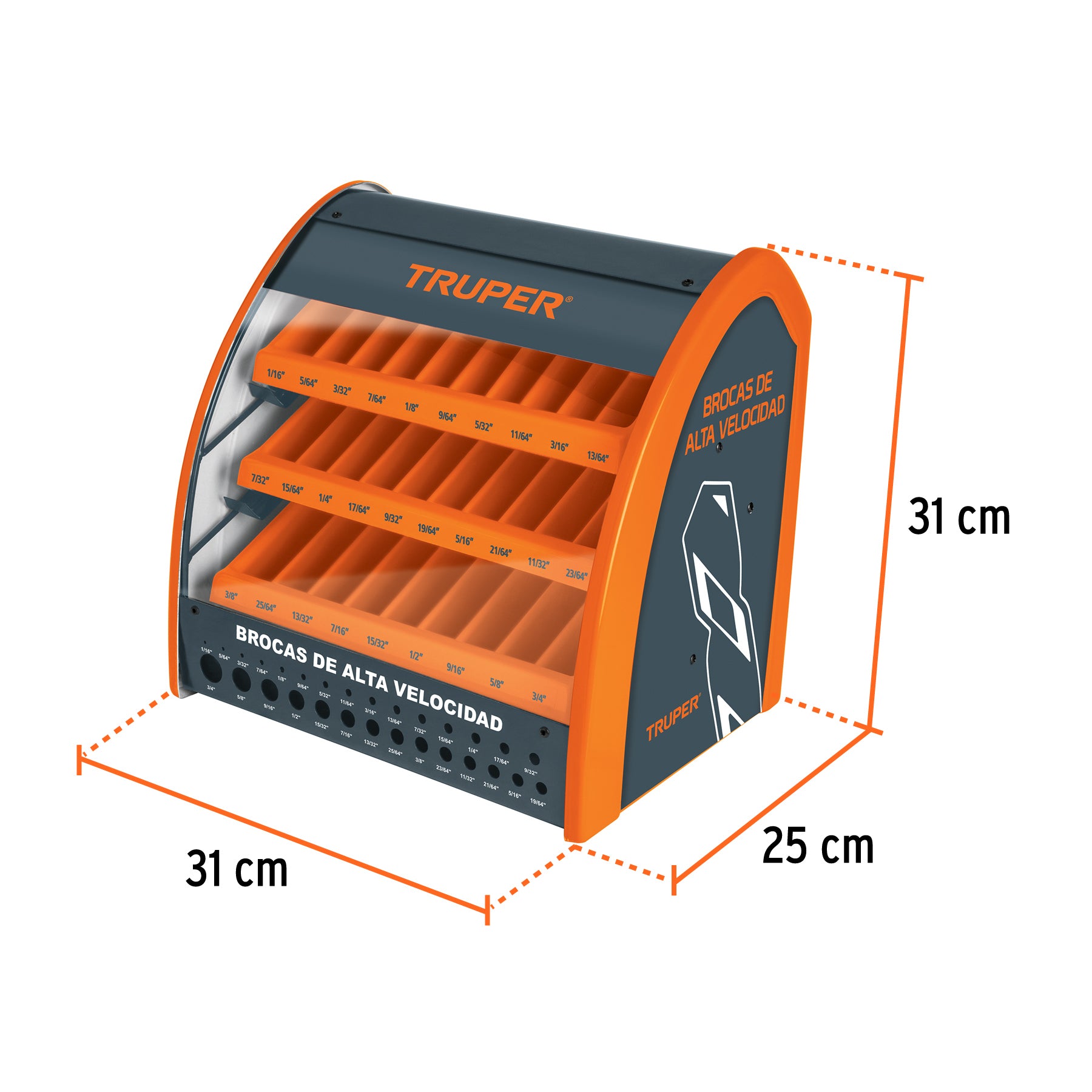 Ideal para organizar y clasificar brocas de alta velocidad, este despachador incluye calibrador de diámetros que permite identificar medidas exactas cuando el usuario no las conoce.