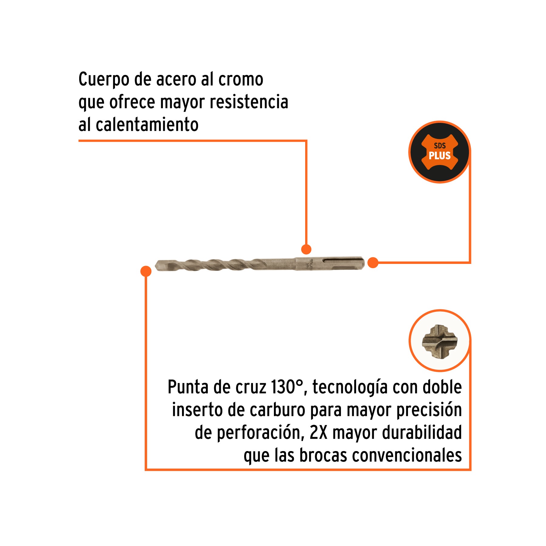Broca SDS Plus de 3/8 x 6 pulgadas con punta de cruz y doble inserto de carburo que ofrece mayor precisión en la perforación y una durabilidad dos veces superior a la de las brocas convencionales. Su cuerpo de acero al cromo garantiza alta resistencia al calentamiento, evitando deformaciones. Es compatible con la mayoría de rotomartillos SDS Plus y está diseñada para evitar atascos durante el uso, además de incluir empaque protector contra el óxido en zonas de alta salinidad.