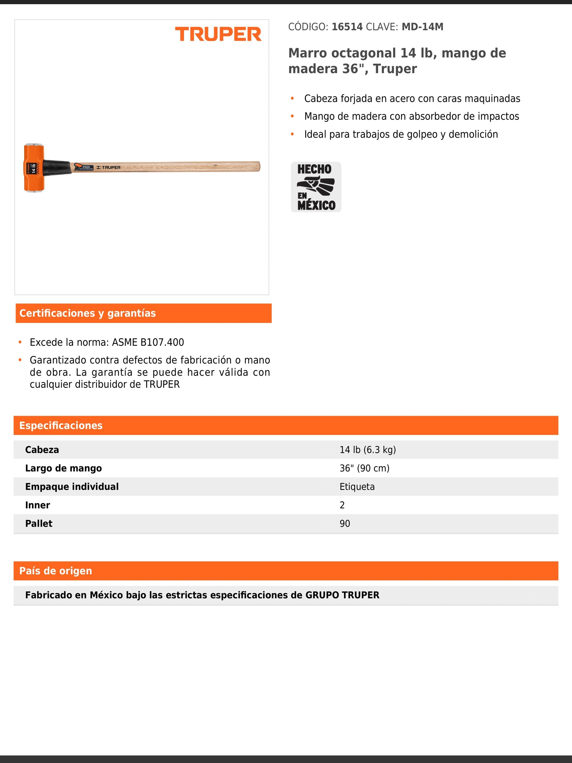 Marro octagonal de 14 libras con mango de madera de 90 cm
