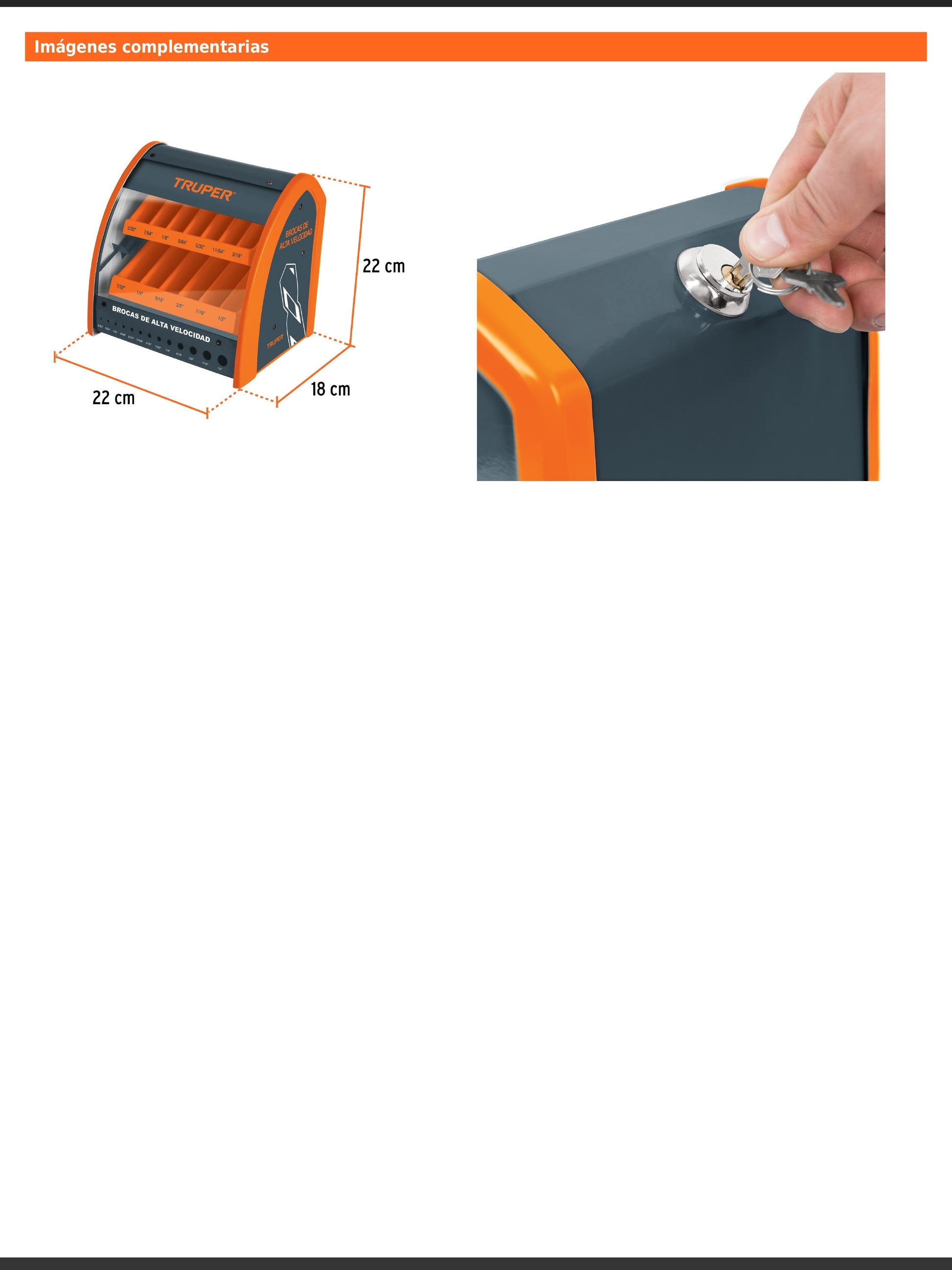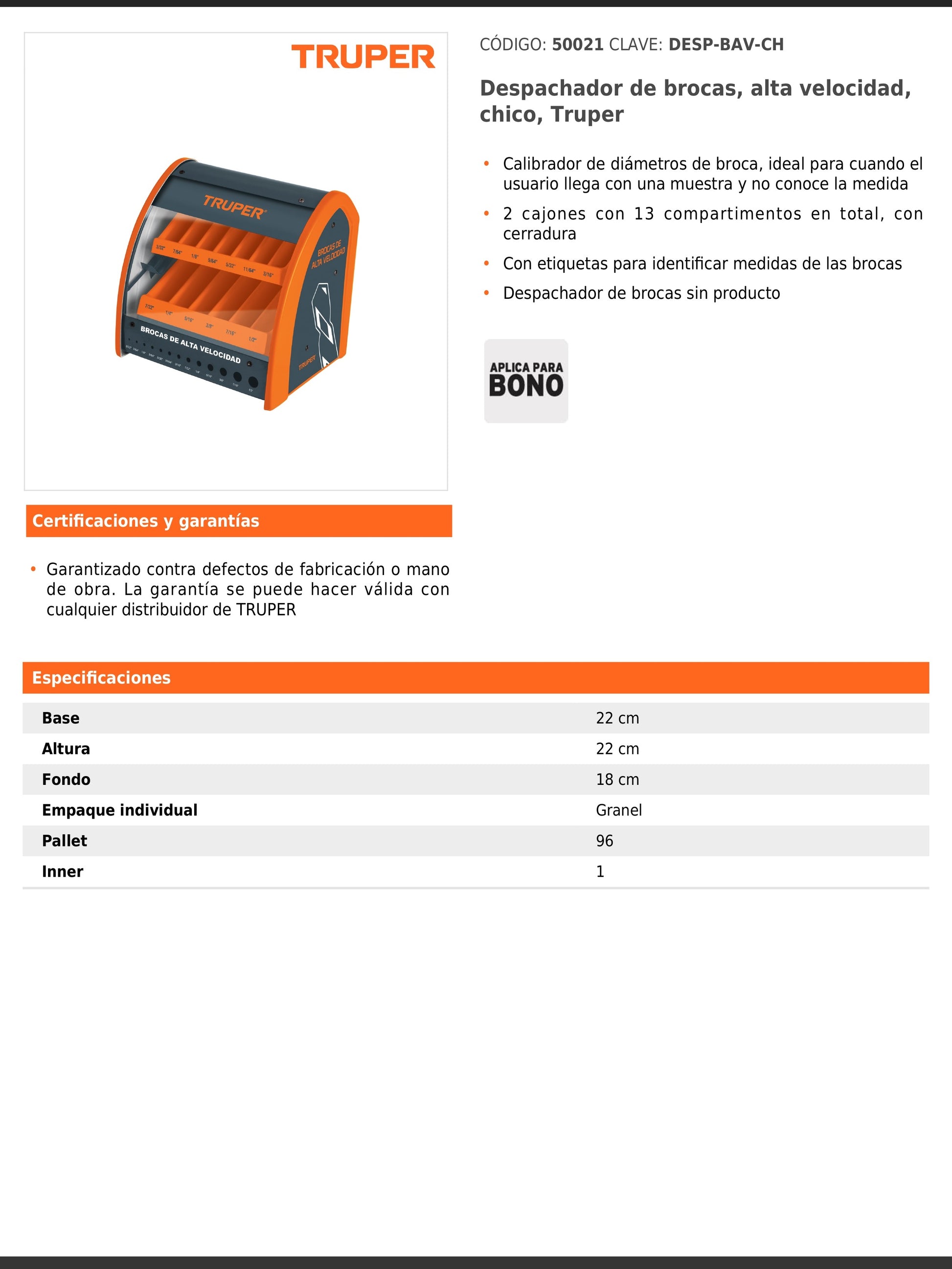 Diseñado para mantener las brocas organizadas y fácilmente identificables, este despachador cuenta con calibrador de diámetros ideal para reconocer medidas exactas. Incluye dos cajones con 13 compartimentos en total, equipados con cerradura y etiquetas identificadoras de medidas. Es un dispensador sin producto, fabricado para uso práctico en talleres y áreas de mantenimiento.