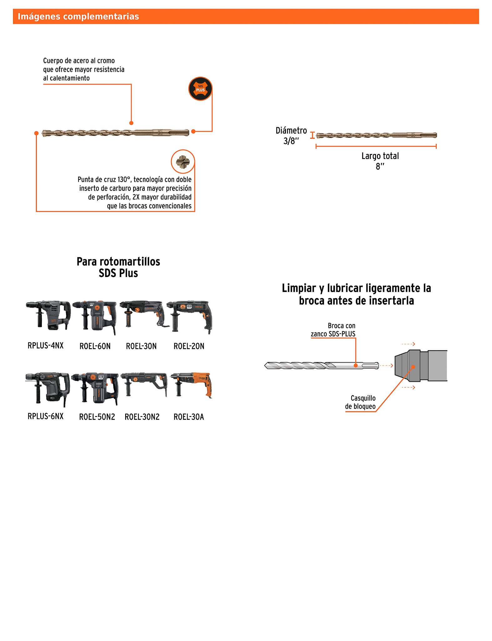 Broca SDS Plus de 3/8 x 8 in con cuerpo de acero al cromo