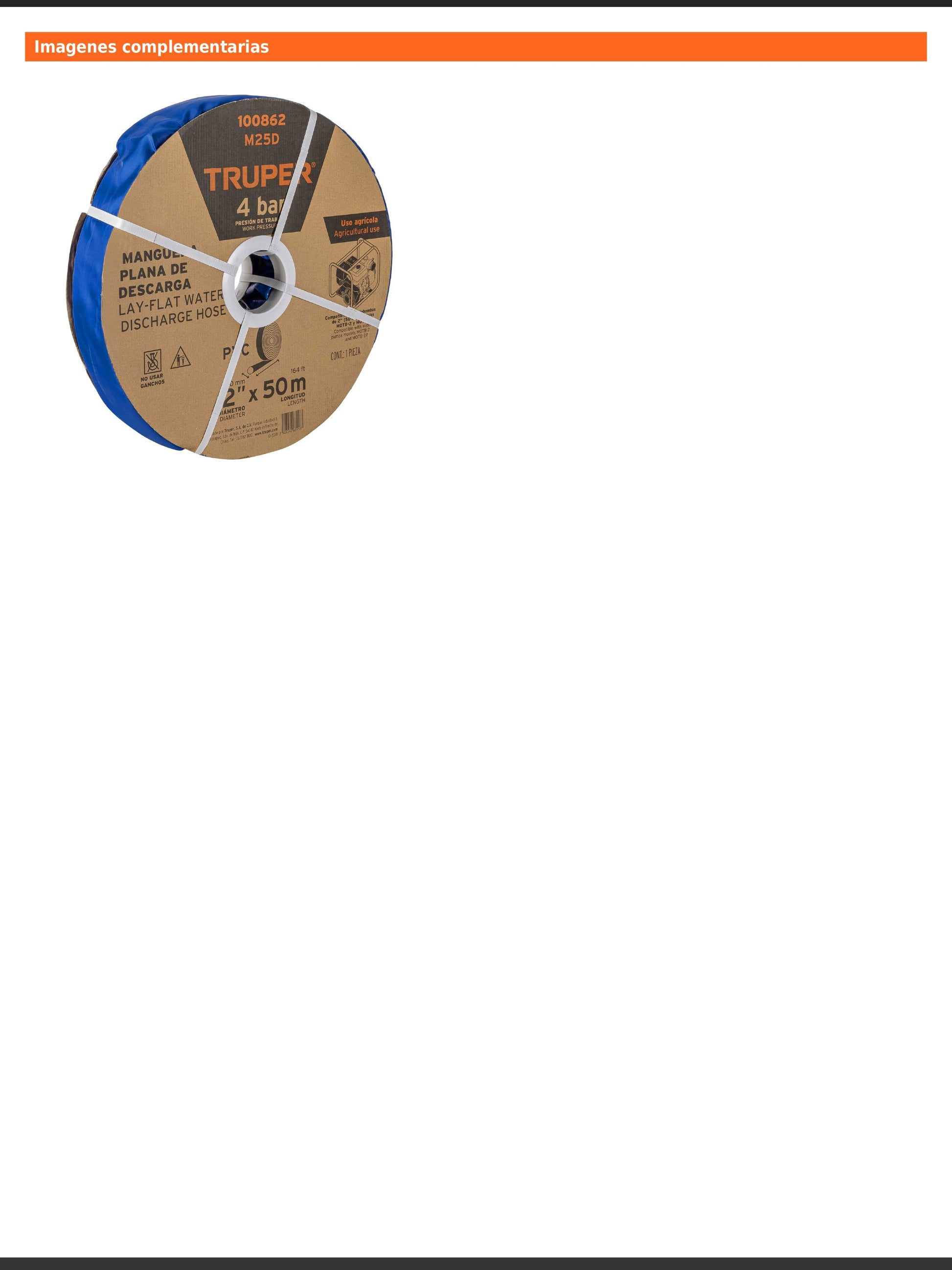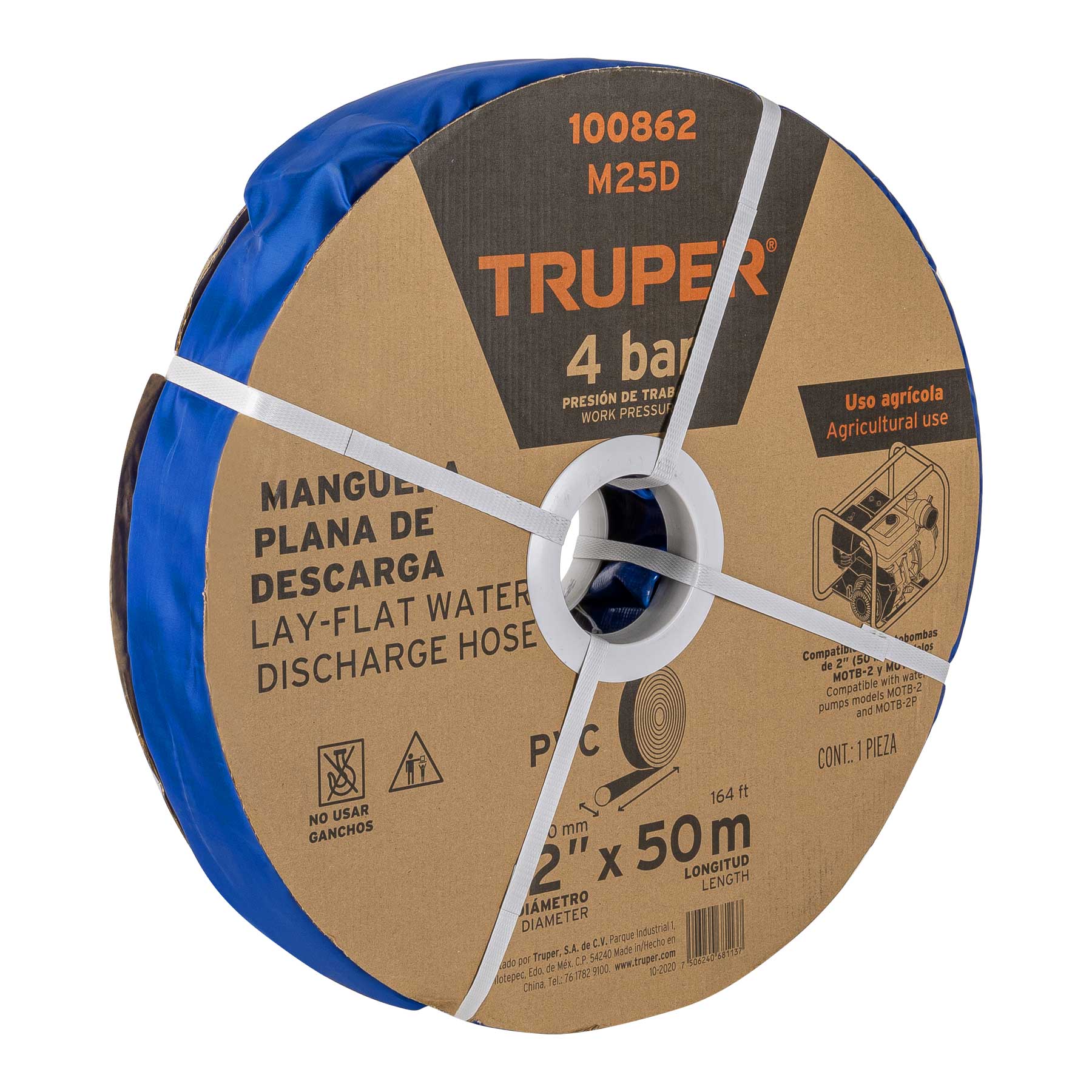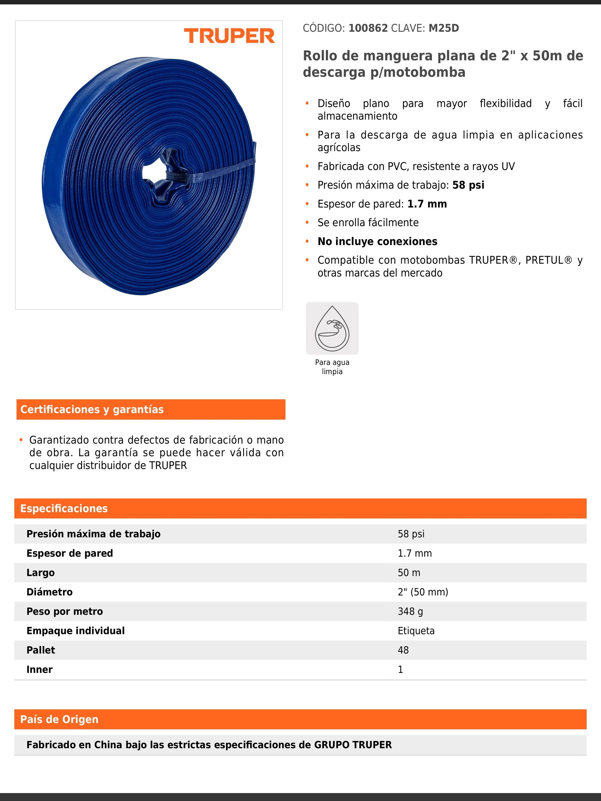 Manguera plana de 2" fabricada en PVC resistente a rayos UV, diseñada para descarga de agua limpia en aplicaciones agrícolas. Su diseño plano permite mayor flexibilidad, fácil almacenamiento y transporte. Soporta una presión máxima de trabajo de 58 psi y cuenta con un espesor de pared de 1.7 mm. Compatible con motobombas Truper, Pretul y otras marcas del mercado. No incluye conexiones.