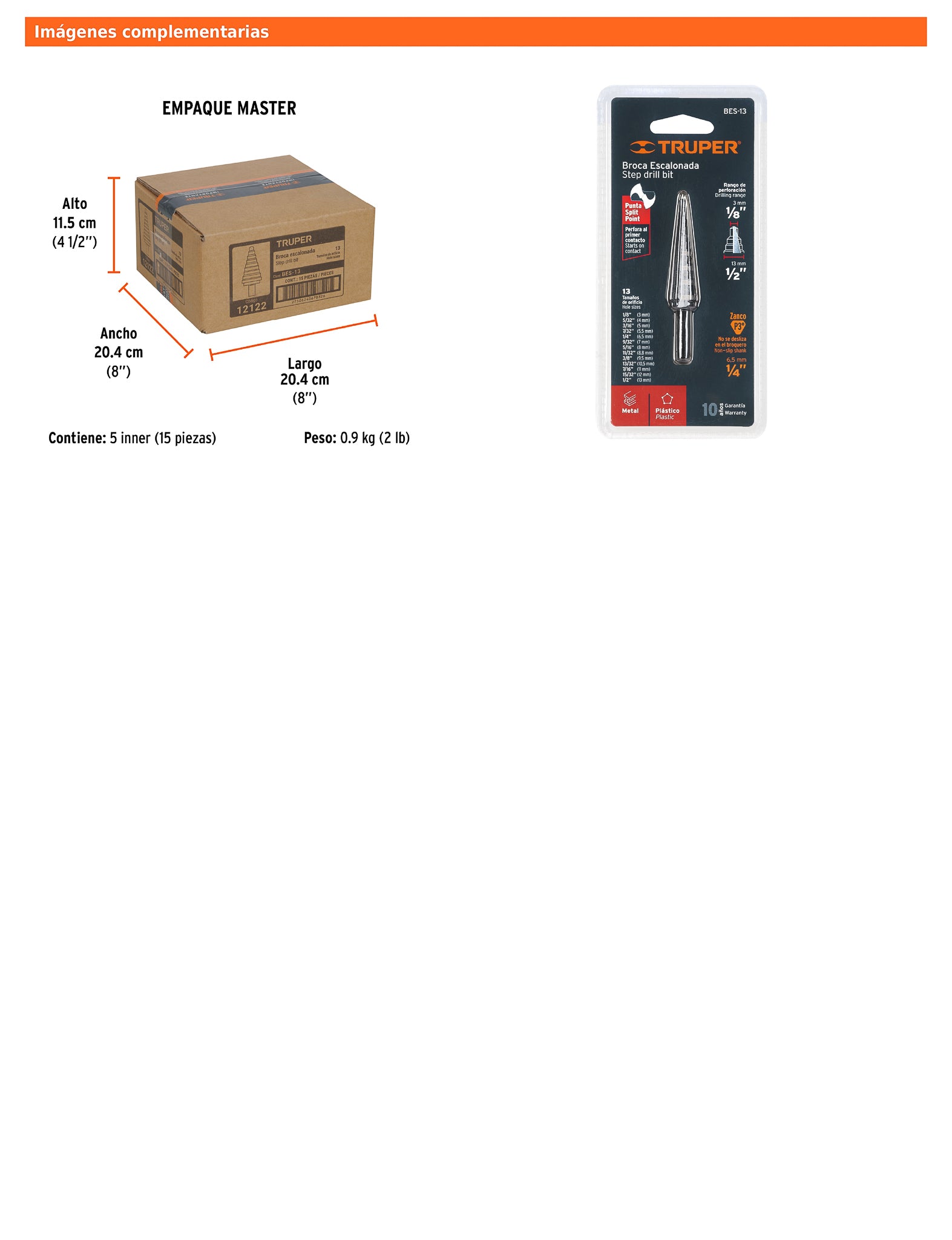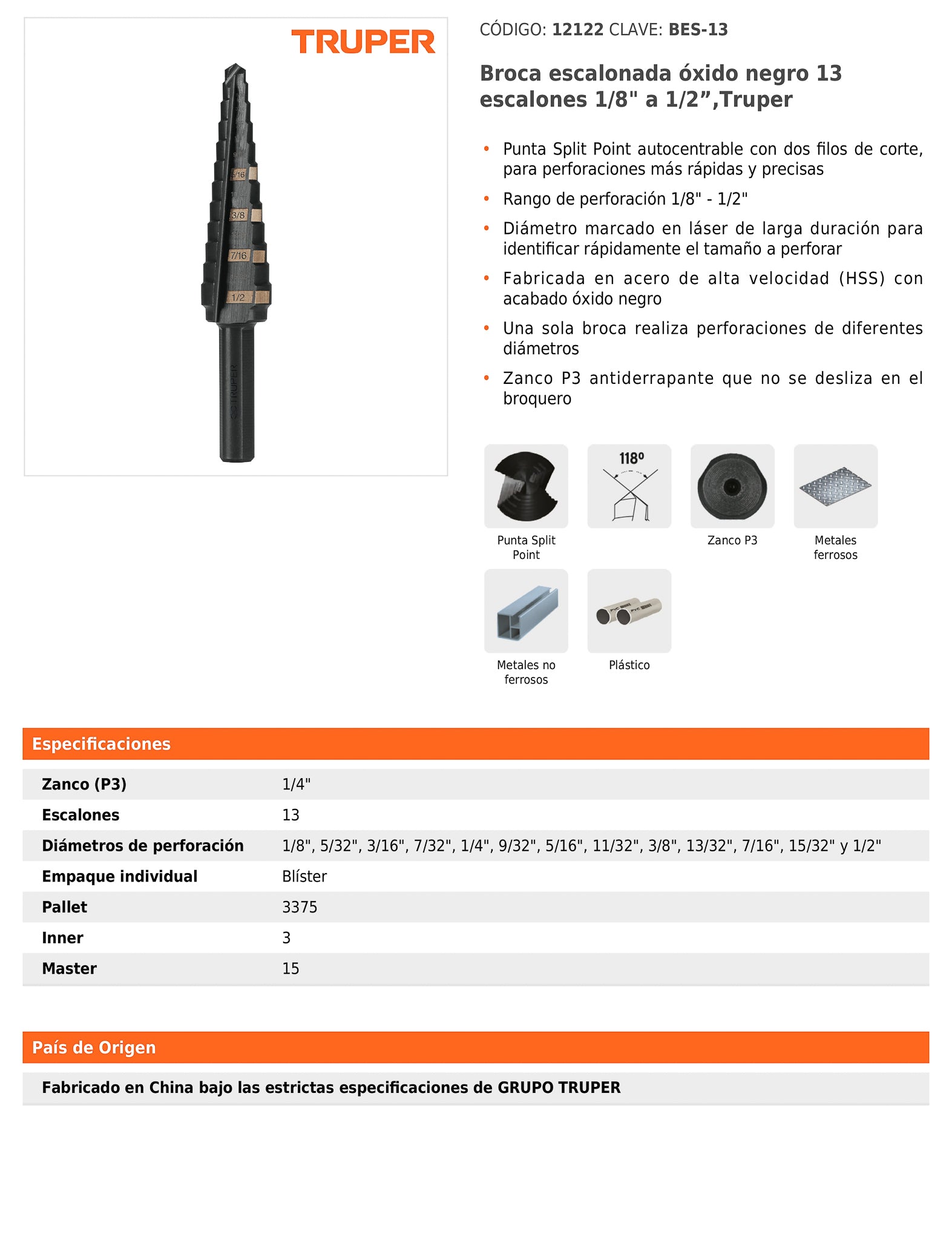 - Diámetros de perforación 1/8", 5/32", 3/16", 7/32", 1/4", 9/32", 5/16", 11/32", 3/8", 13/32", 7/16", 15/32" y 1/2".