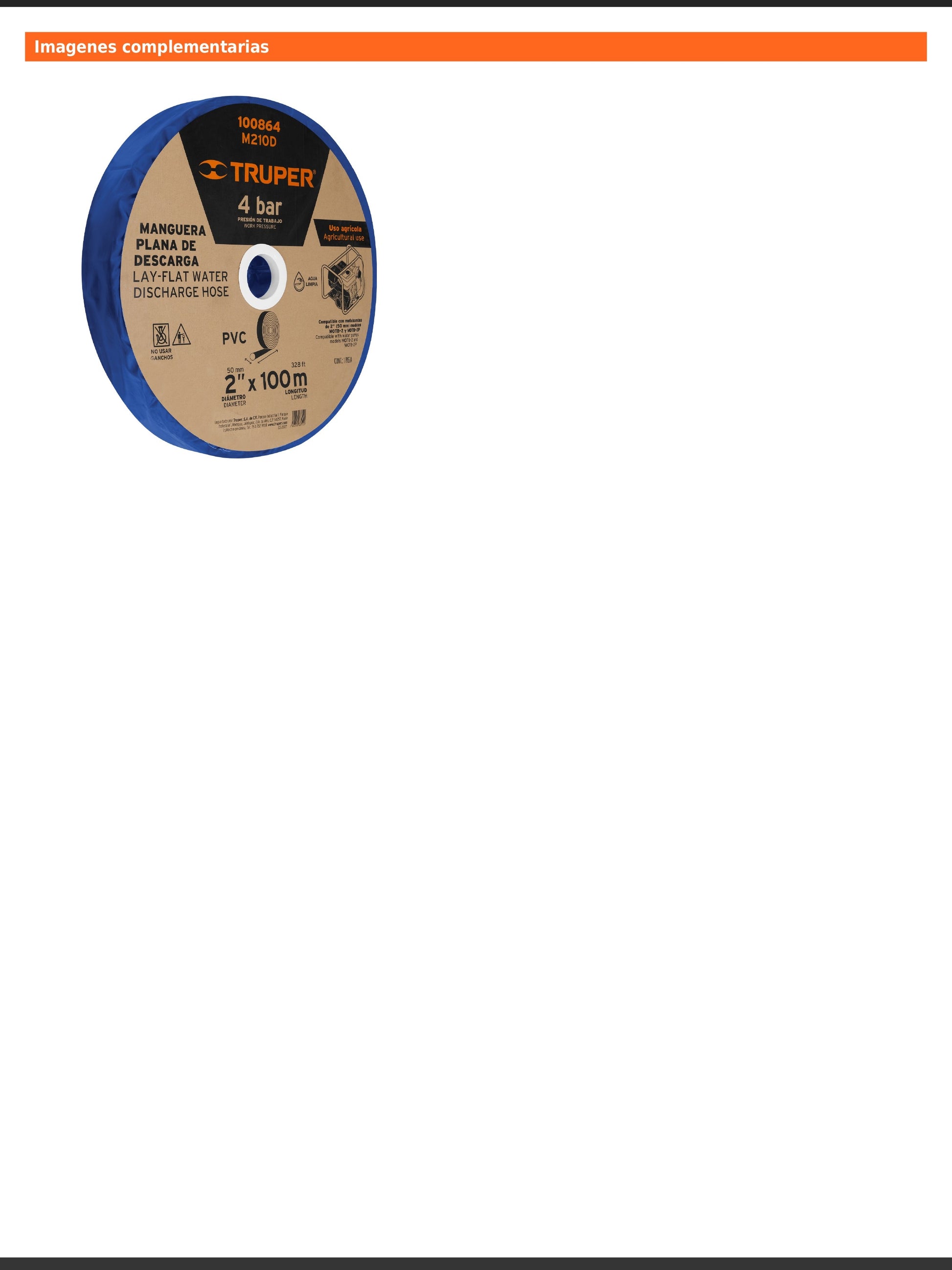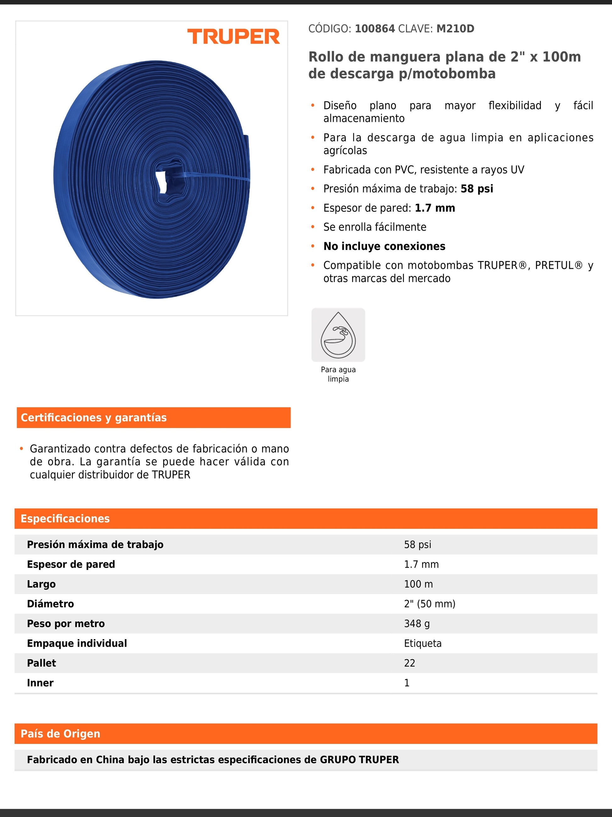Manguera plana de 2" fabricada en PVC resistente a rayos UV, con diseño flexible que facilita el almacenamiento y transporte. Su espesor de pared de 1.7 mm y la presión máxima de trabajo de 58 psi garantizan un uso confiable en aplicaciones agrícolas. Es compatible con motobombas Truper, Pretul y otras marcas del mercado. No incluye conexiones.