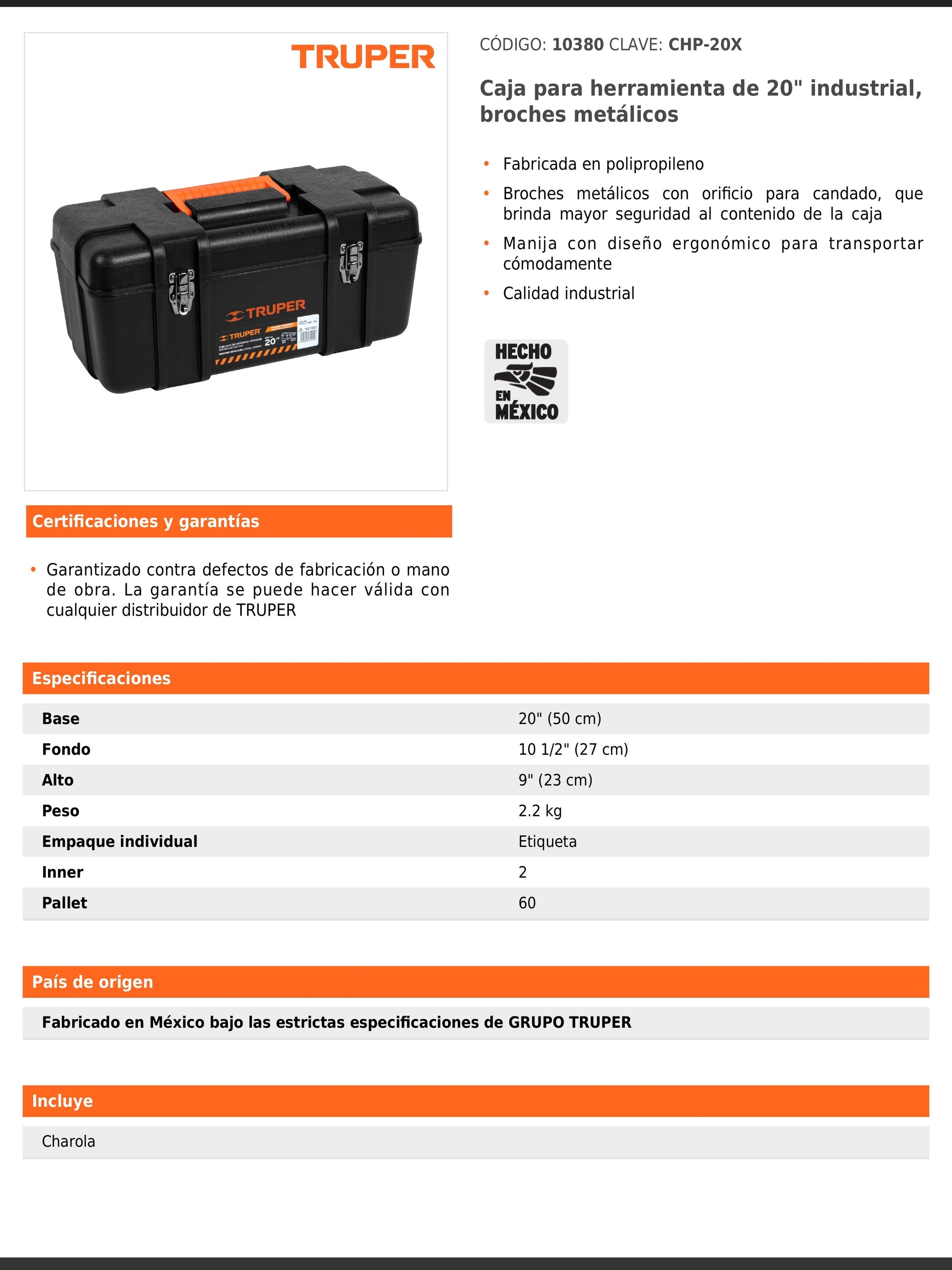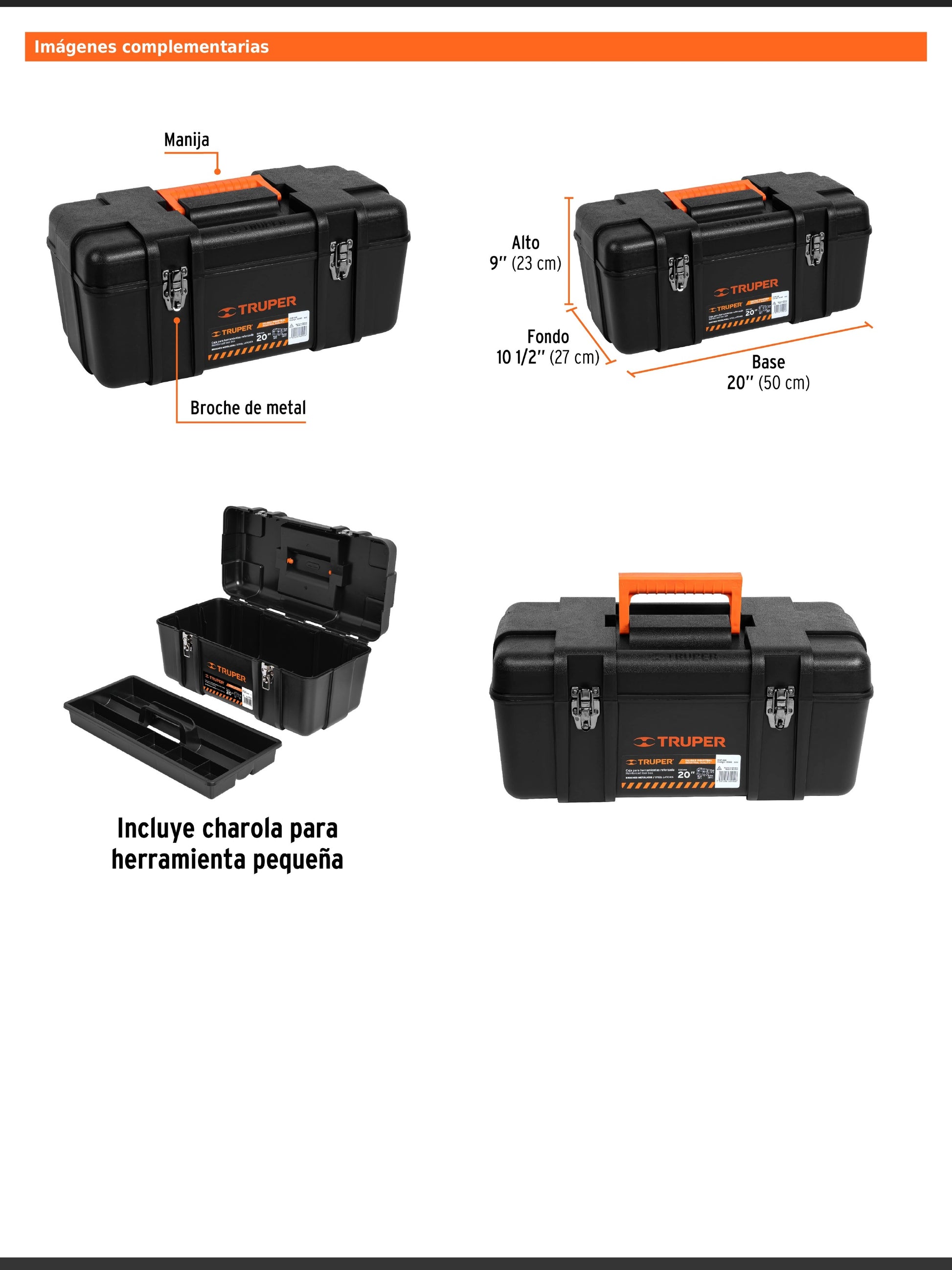 Fabricada en polipropileno, cuenta con broches metálicos con orificio para candado que aportan mayor seguridad al contenido. Incorpora una manija con diseño ergonómico para un transporte cómodo y está diseñada con calidad industrial. Incluye charola interior.