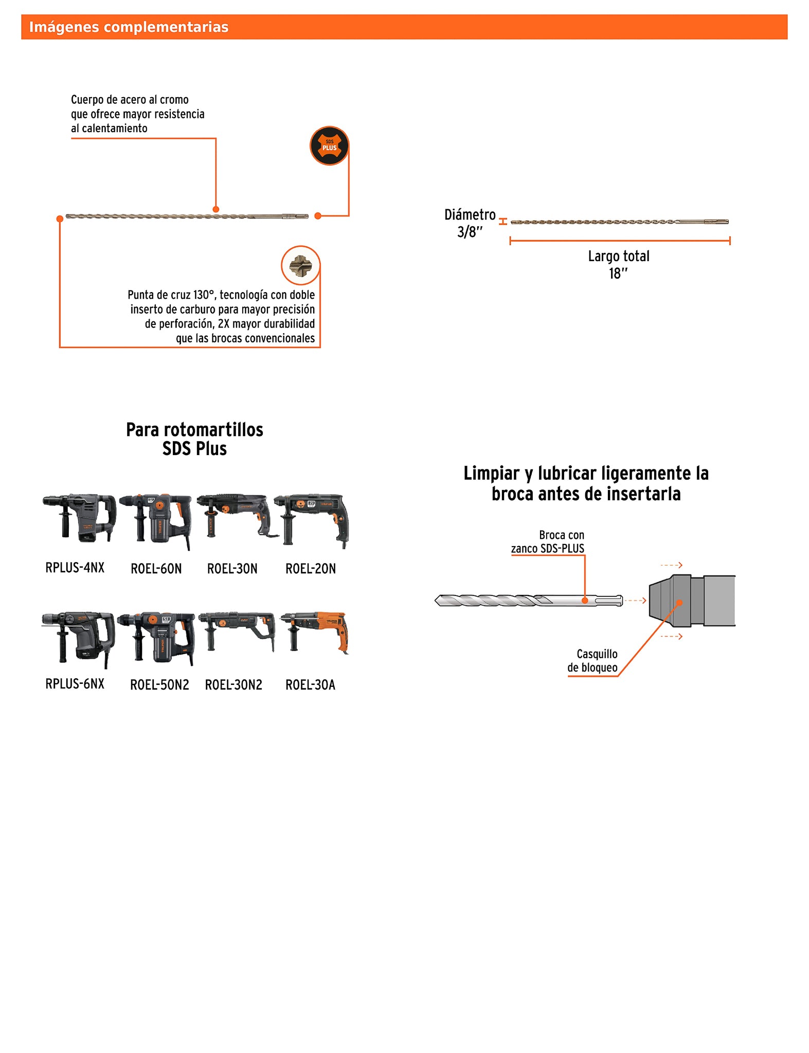 - Compatibilidad con rotomartillos SDS Plus.