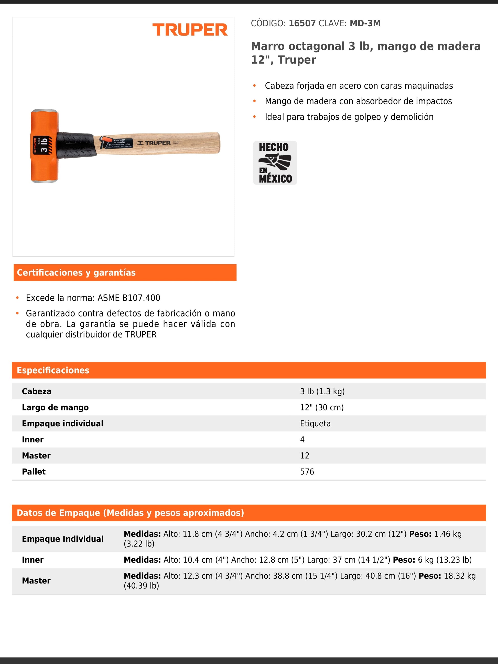 Marro octagonal con cabeza forjada en acero y caras maquinadas, equipado con mango de madera de 30 cm con absorbedor de impactos. Ideal para trabajos de golpeo y demolición, cumpliendo con normas de resistencia y seguridad.