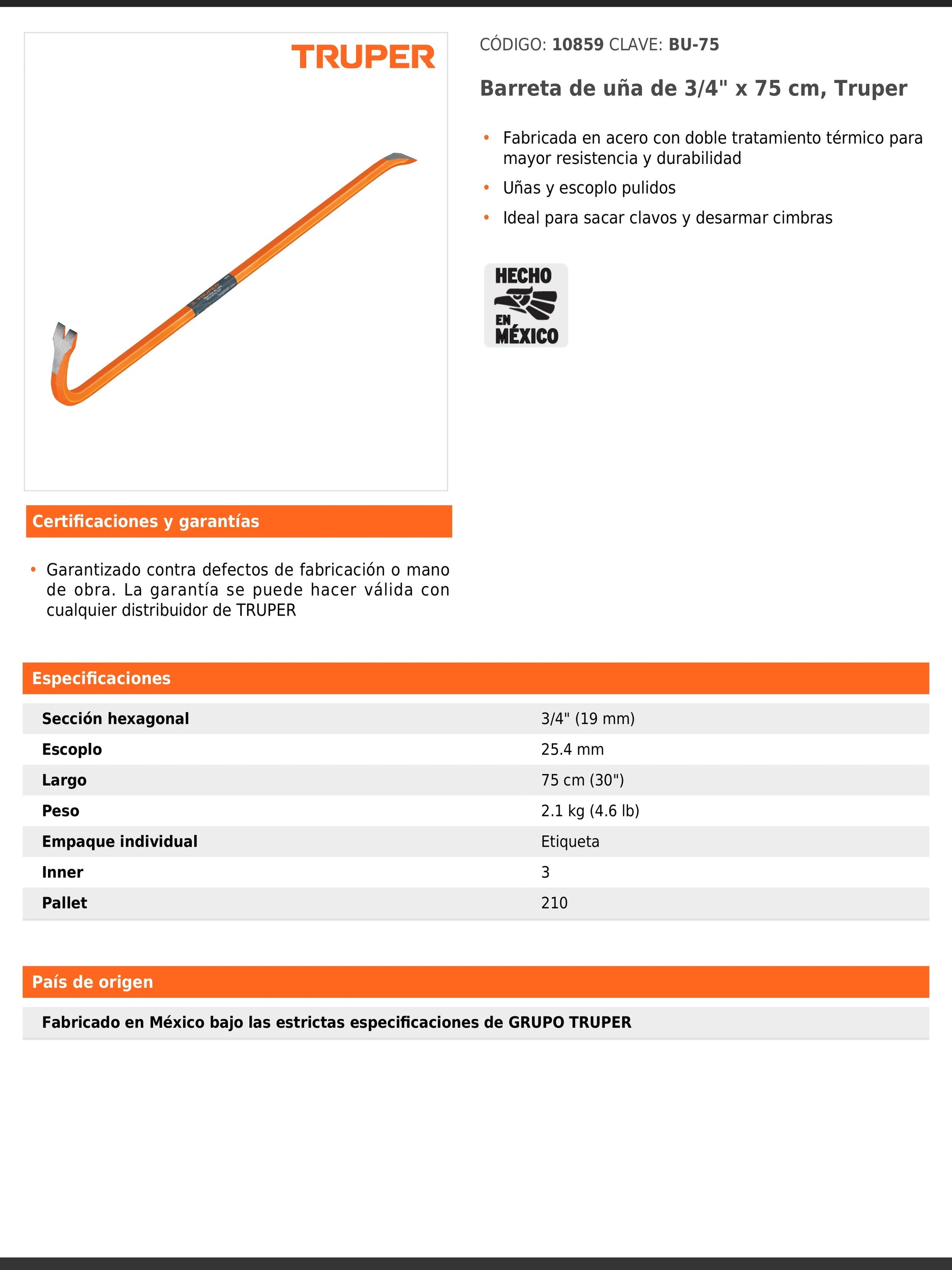 - País de origen: Fabricado en México bajo las estrictas especificaciones de Grupo Truper.