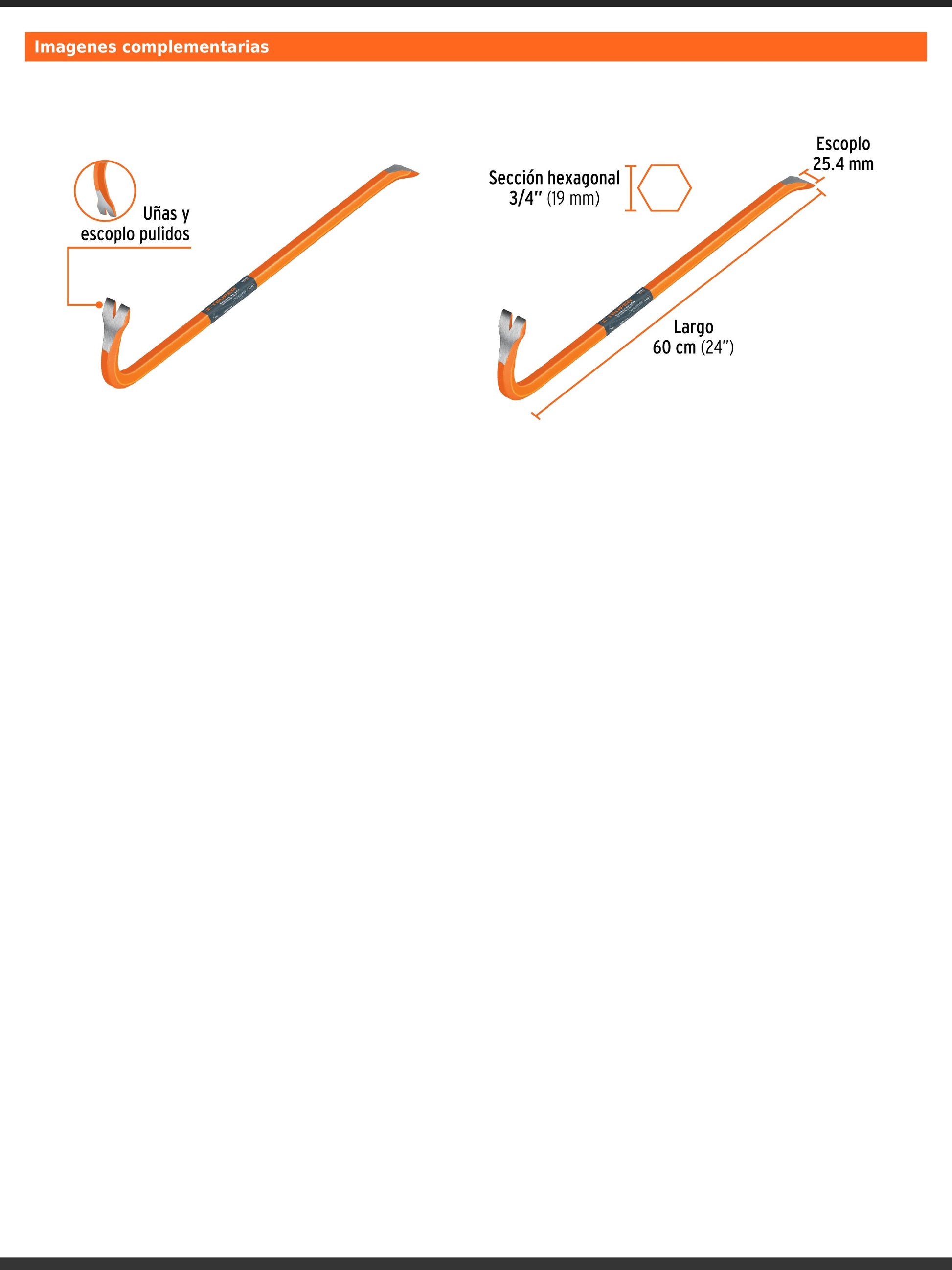 Barreta de uña fabricada en acero con doble tratamiento térmico para mayor resistencia y durabilidad, con sección hexagonal de 3/4 in (19 mm), uñas y escoplo pulidas, y 60 cm de largo para trabajos de palanca y demolición. Garantizada contra defectos de fabricación con cualquier distribuidor autorizado.