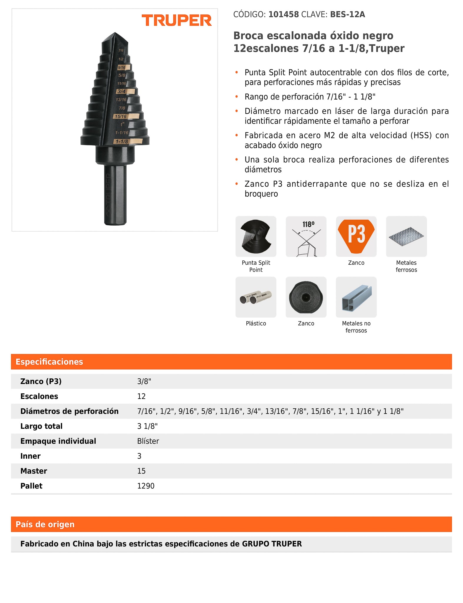 Ideal para perforaciones precisas y rápidas, esta broca cuenta con punta Split Point autocentrable que mejora el centrado y la velocidad de corte. Su diseño escalonado permite realizar distintos diámetros con una sola herramienta, mientras el zanco P3 antiderrapante evita deslizamientos en el broquero.