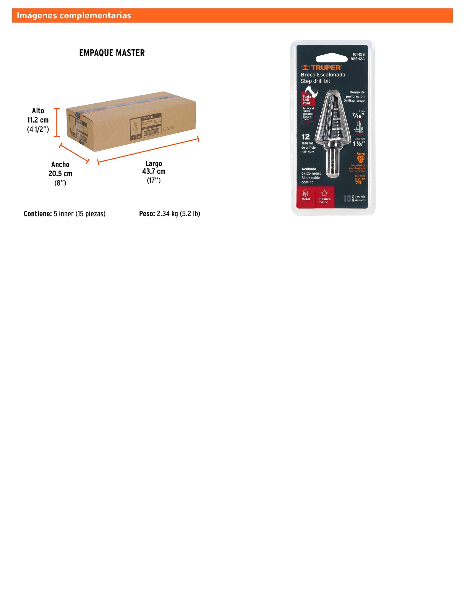 - Diámetros de perforación 7/16", 1/2", 9/16", 5/8", 11/16", 3/4", 13/16", 7/8", 15/16", 1", 1 1/16" y 1 1/8".