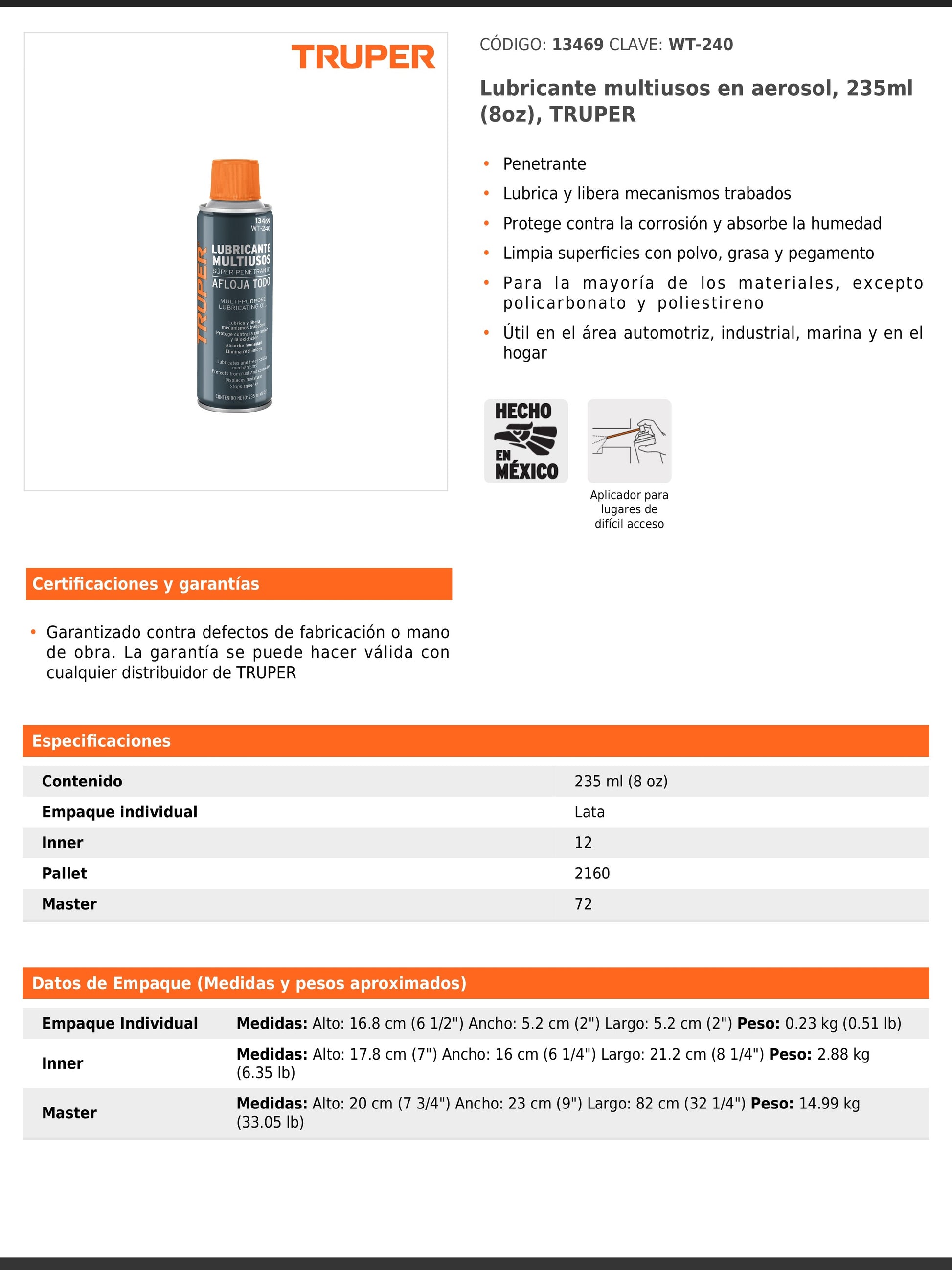 Lubricante multiusos en aerosol con propiedades penetrantes que lubrican y liberan mecanismos trabados. Protege contra la corrosión y absorbe la humedad, además de limpiar superficies con polvo, grasa y pegamento. Es útil en el área automotriz, industrial, marina y en el hogar, compatible con la mayoría de materiales excepto policarbonato y poliestireno. Incluye aplicador para lugares de difícil acceso. Garantizado contra defectos de fabricación o mano de obra con cualquier distribuidor autorizado.