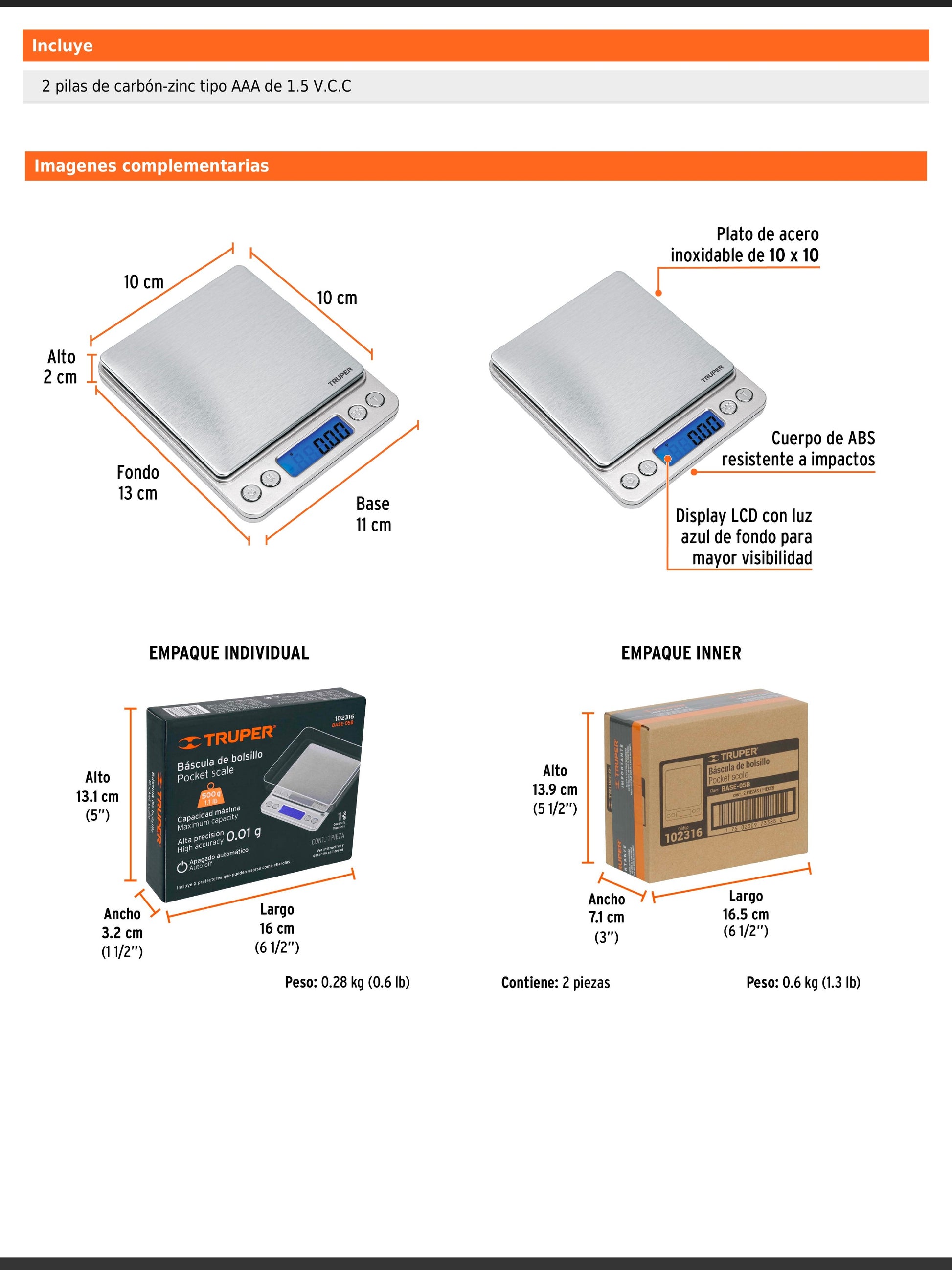 Báscula electrónica de precisión de bolsillo de 500 g con cuerpo de ABS y cubierta de poliestireno. Tiene plato de acero inoxidable de 10x10 cm, display LCD azul, función TARA, conteo de piezas, apagado automático, división mínima de 0.01 g y pesada mínima de 0.2 g. Usa 2 pilas AAA incluidas y es ideal para cocina, laboratorios y joyería.